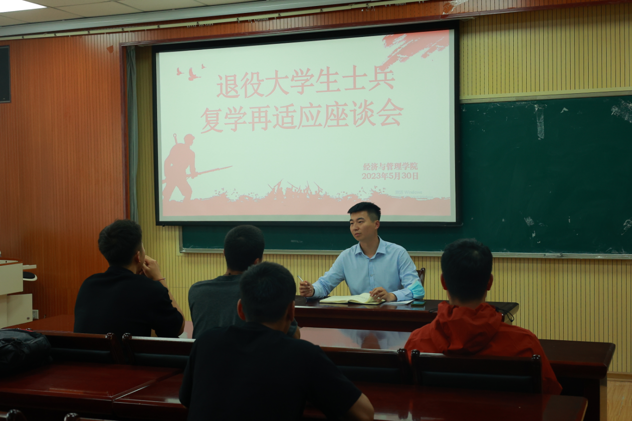为深入了解我院退役复学大学生士兵返校后的思想、学习、生活等各方面情况,切实关心退伍学生的成长成才,激励退役大学生士兵继续发扬军人的优良作风,尽快转变身份适应新的校园生活,经管学院于5月30日在经管楼419召开退役大学生士兵座谈会。