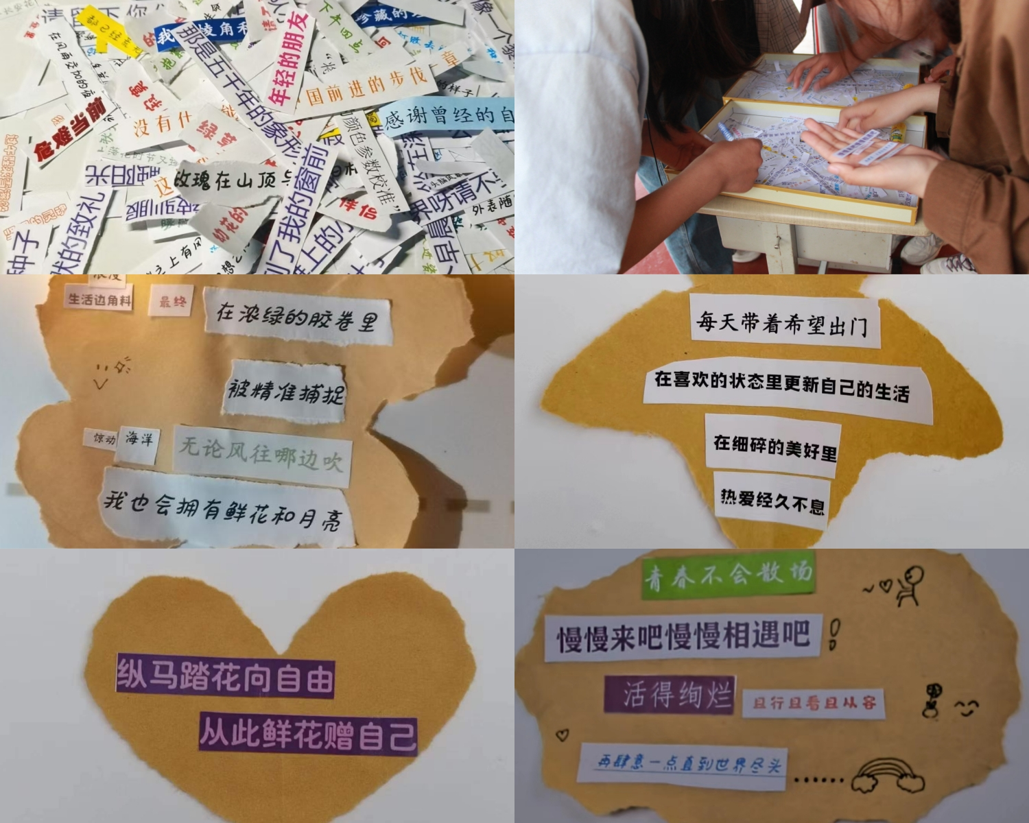 一句句关乎“青春”的片段,拼出属于“数理人”的诗和远方。思想和文艺在“户外拼读活动”中碰撞,“青春、奋斗、掌声、鲜花、春日、美好……”一切美好的字眼和诗句汇聚于此,师生们怀揣着“十二封信”的答案,拼出一首首属于自己的青春诗篇。活动中,师生在校园绿茵场上精心裁剪、拼贴、赏析、吟诵,互赞诗歌之美,在口诵心惟中引发情感共鸣,收获个人成长,感悟家国美好。