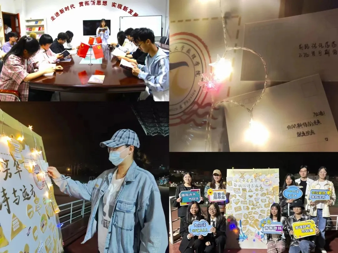 明灯雅室,书声琅琅,数十名青年学生端坐在一起共享书香、漫谈体悟;初夏操场,微光摇曳,户外拼读活动把心得感悟写成信,变成诗……近日,数理学院举办的“诵读青春芳华,致信诗与远方——师生同读一本书第3期”沉浸式阅读体验活动掀起了新一轮阅读热潮,带动了一批又一批的数理学子从阅读中获取精神食粮,沉淀文化底蕴,积蓄精神动力。