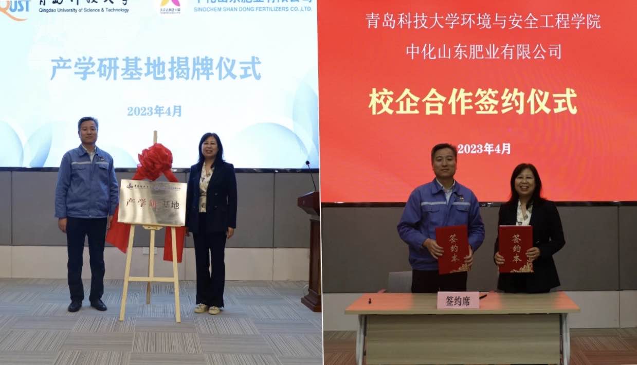 王青一行先后到金正大生态工程集团股份有限公司、山东翔宇健康制药有限公司、山东省临沂市三丰化工有限公司、施可丰化工股份有限公司、中化山东肥业有限公司等企业进行实地考察交流。在走访调研过程中,企业负责人介绍了公司的基本情况、业务范围、战略布局、人才需求等情况。王青介绍了环境学院的学科专业、师资队伍、办学特色、人才培养和毕业生就业情况,双方就人才培养与需求、环保与安全发展、技术合作研发、校企合作实习等方面进行了深入探讨,达成初步合作共识。其中,在与中化山东肥业有限公司的对接交流中,王青代表学校与中化山东肥业有限公司党委书记、总经理阚洪福进行了产学研基地揭牌仪式,并代表学院与其签署校企合作协议,双方表示将以“资源共享、互惠互利、共同发展”为原则,在党建共建、人才培养、技术交流、实训基地建设等方面开展更加广泛、深入的交流与合作,共同为双方实现高质量发展寻求全方位的新突破。