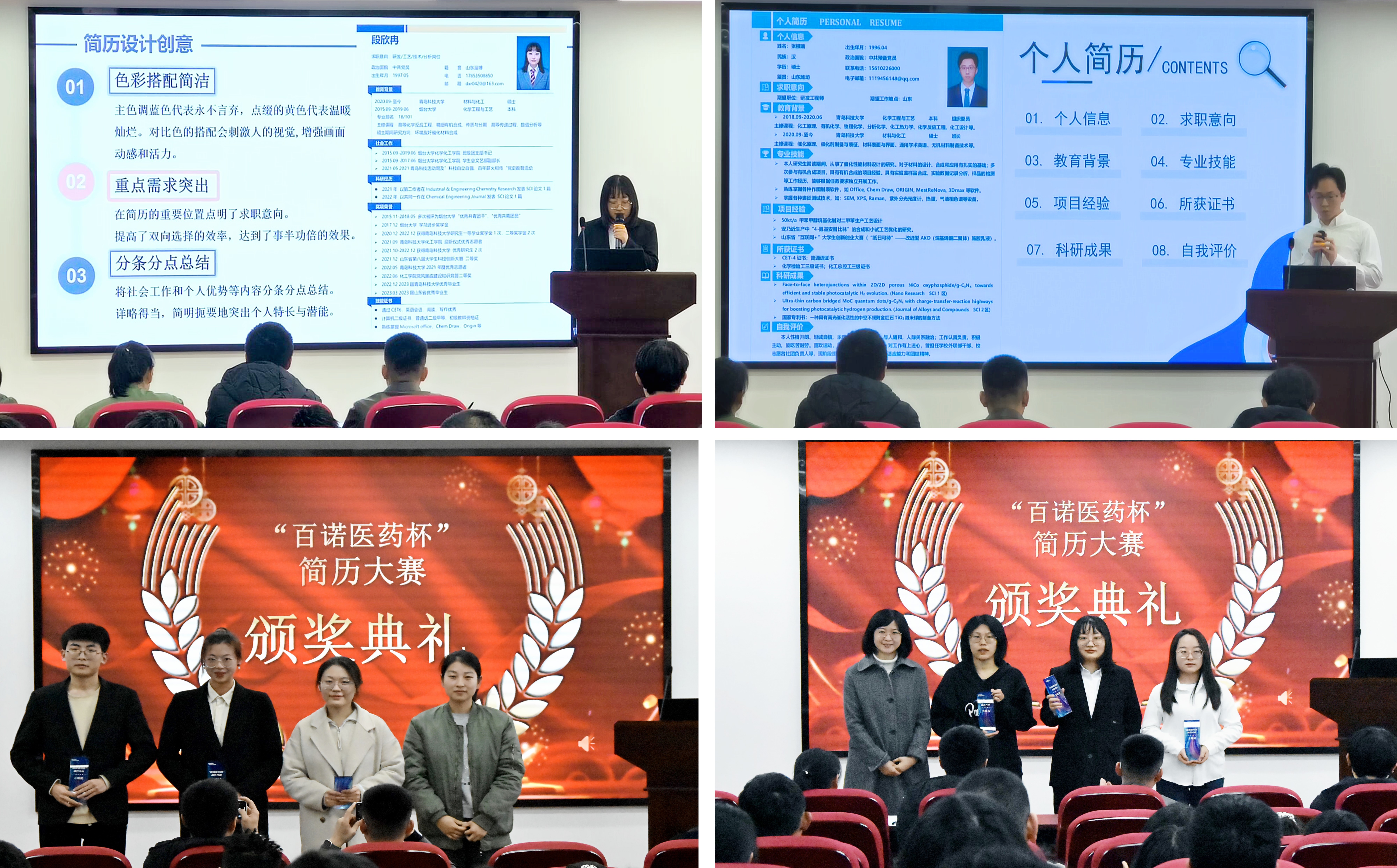 为进一步提高学生的简历制作水平,提升就业竞争力,助力学院毕业生高质量就业。近日,化工学院、化学院、百诺医药有限公司联合主办的“百诺医药杯”简历制作大赛在学院报告厅举行。