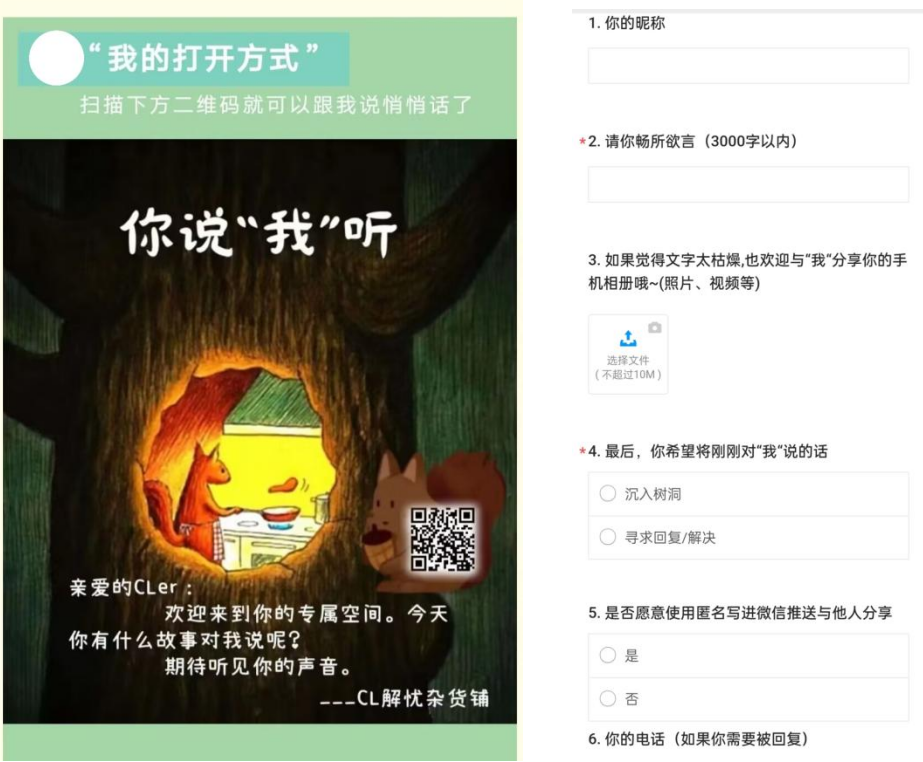 为引导学生觉察自我,倾诉困惑,释放压力,完善认识。材料学院创建“解忧杂货铺”线上倾诉平台, 同学们可以通过这个解忧树洞来诉说自己的烦恼,释放心理压力。希望以此活动为引,鼓励同学们积极向外界倾诉烦恼,在被治愈的同时也向他人传递一份温暖与善意。