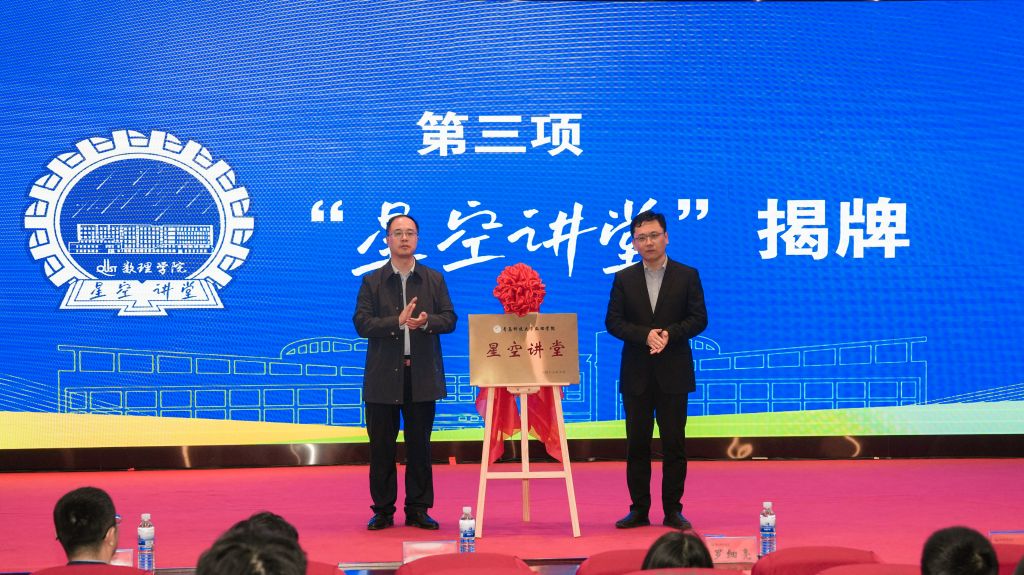2023年3月14日是第四个“国际数学日”。当日下午,学校首届数理文化节开幕式在崂山校区第三报告厅举行。学校党委常委、副校长罗细亮,党委常委、宣传部部长张洪坤出席开幕式并为数理学院“星空讲堂”揭牌。学生处、校团委、研究生院等部门负责人,数理学院党政领导班子成员、师生代表等200余人参加活动。
