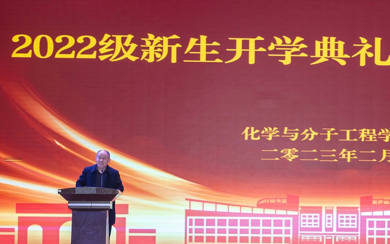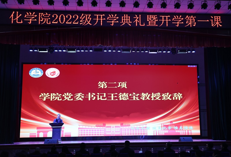 王德宝代表学院师生对2022级新生的到来表示热烈欢迎。王德宝介绍了化学院的师资力量、教学科研成果等。王德宝对新生提出三点希望:一是化院学子当有大智慧,疫情转段后一切都在发生变化,大家要放弃“家长编写的人生剧本”中的角色,摆脱网络信息的“奴役”,在化学世界里寻找更加精彩、更有价值的人生舞台。二是化院学子当有大格局,置身民族复兴和化学发展的大局中去审视自己、规划当下、奋斗未来,做超越历史的强国一代。三是化院学子当有大情怀,拥有热爱祖国、追求真理、敬畏生命、科学严谨的精气神,善于用化学观照世界。