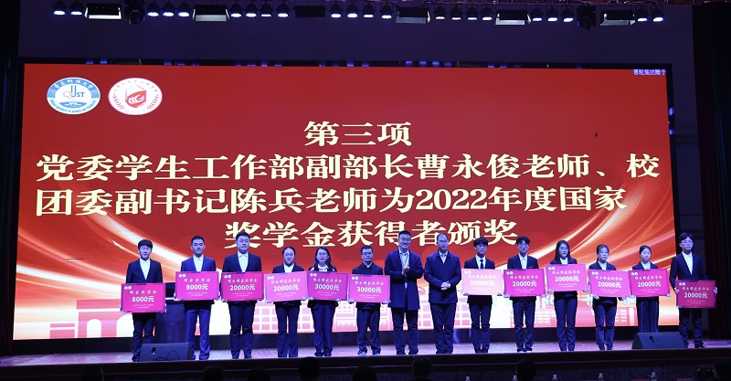 开学典礼上,曹永俊、陈兵为2022年度国家奖学金获得者颁奖。张同雷向新生代表颁发百诺医药水杯。