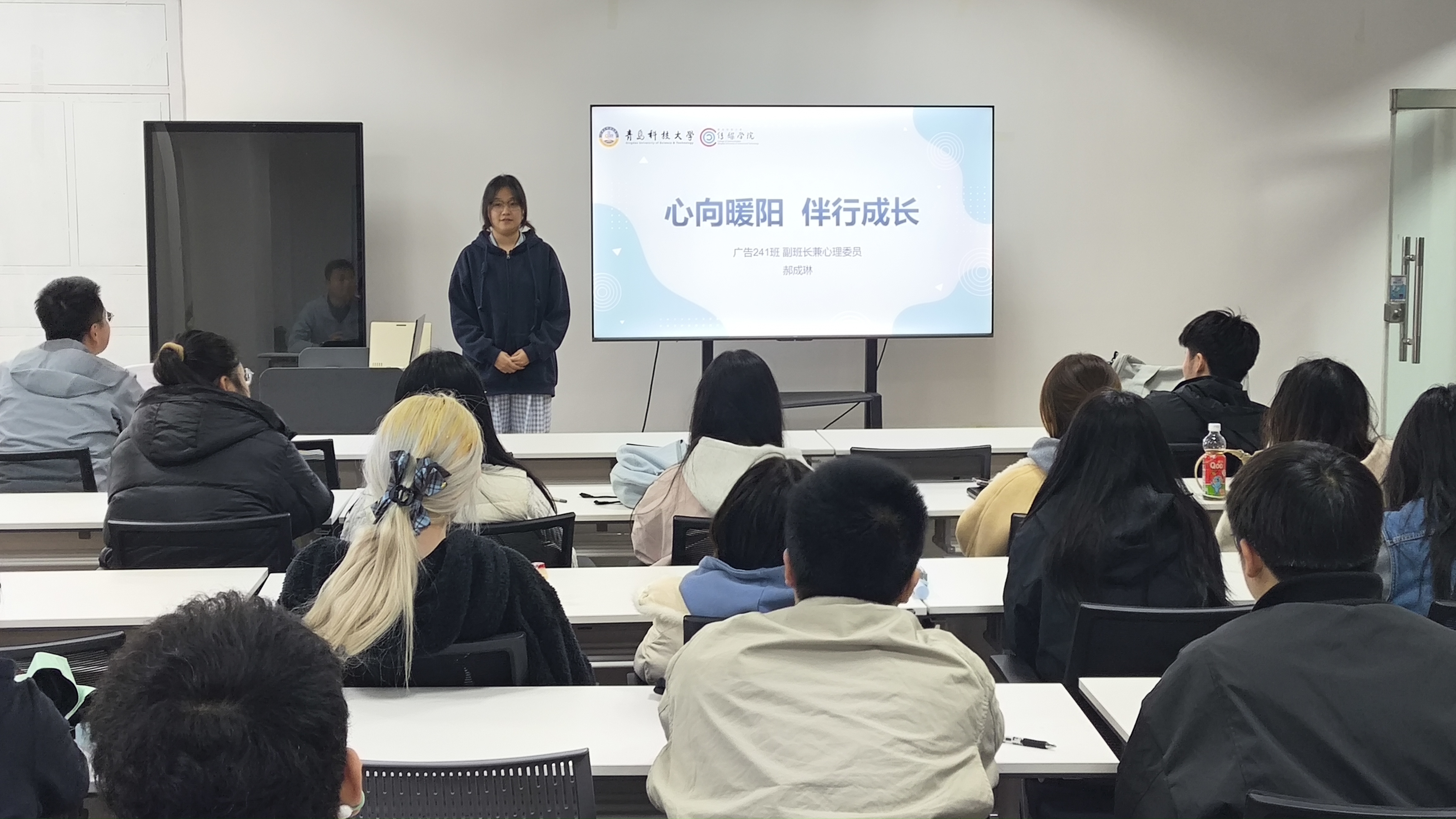 在经验分享环节,去年学院“优秀心理委员”、广告241班郝成琳同学结合自身工作实践,分享了自己打造“班级心晴角”、组织“压力疏导班会”、建立“一对一倾听机制”等特色工作举措,通过具体案例展现了心理委员如何用真诚与专业搭建同学信任的桥梁。她的分享贴近实际、真挚生动,为心理委员们提供了可借鉴的实践范本。