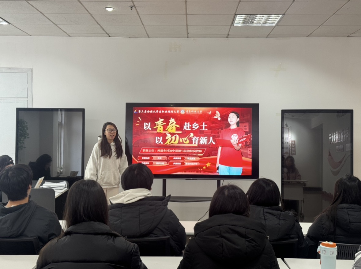会上,25级工商管理学硕肖洋作为参赛选手进行了模拟答辩。她立足工商管理学专业视角,以“西部乡村初中道德与法治教师”为职业目标,系统构建了“专业适配—行业深耕—价值创造”的三维规划体系。在自我认知环节,她结合MBTI性格分析与专业课程成绩,论证了“管理思维+思政素养”对乡村教育岗位的适配性;在职业环境分析中,她援引《关于加强新时代乡村教师队伍建设的意见》等政策文件,结合西部乡村学校调研数据,阐明乡村德育教师的人才缺口与发展潜力。