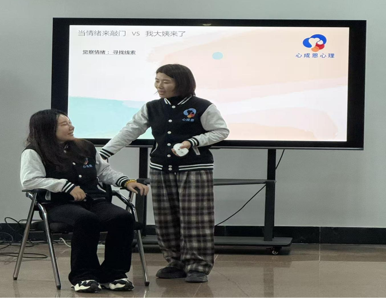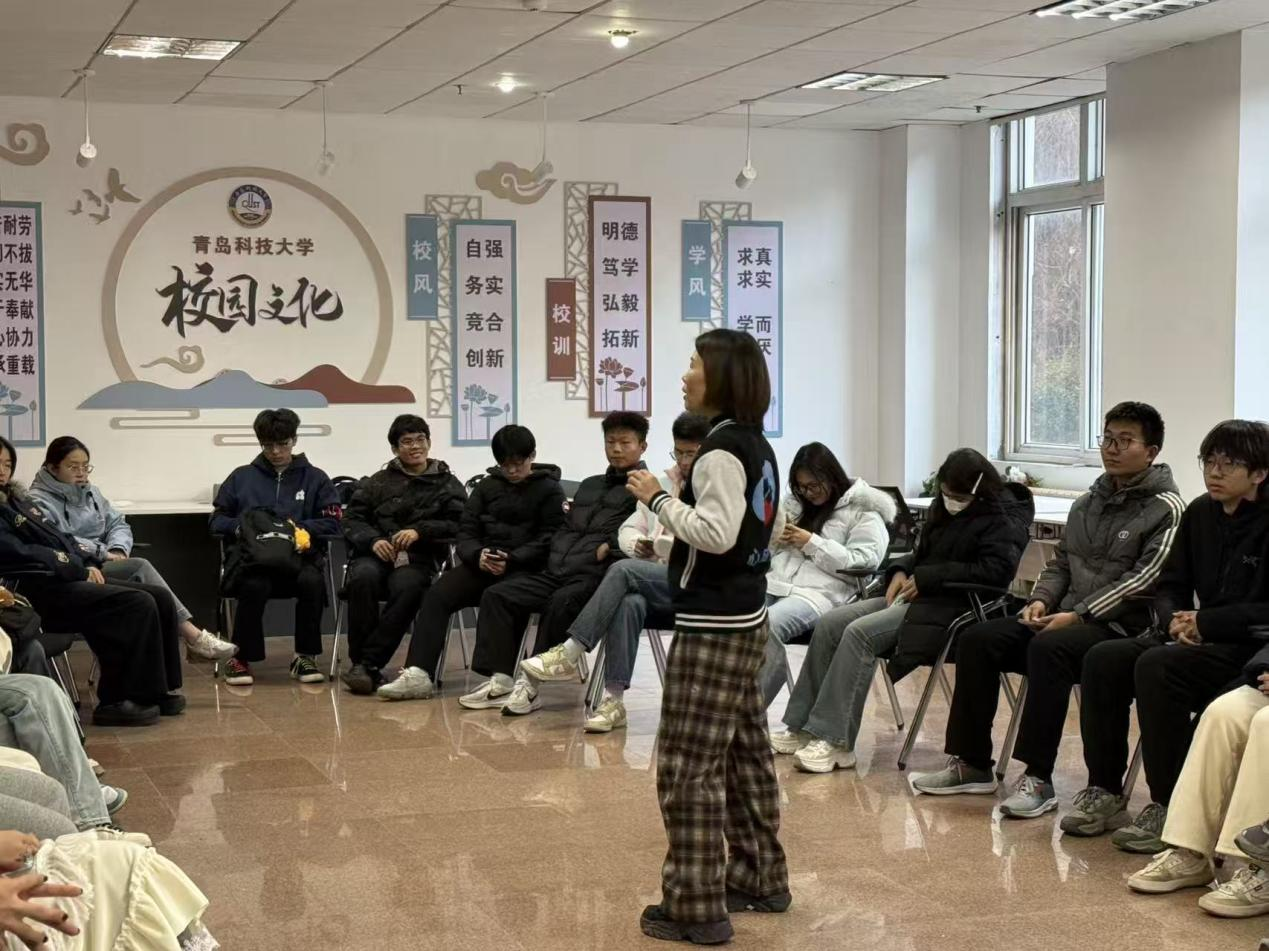 活动伊始,李昆从大学生的烦恼直接切题,分析情绪反应,深入解析情绪的本质。她指出,情绪是一种内在能量,关联新陈代谢与生命活力,更是自我不可或缺的组成部分,引导同学们重新认知情绪的价值。随后,李昆通过情景表演,让同学们在生动地演绎中觉察自己的情绪。在“你比我猜,情绪接龙”的小游戏中,师生互动与情感链接进一步强化同学们对情绪的感知力。大家从初步接触到深度交流,从指尖触碰、击掌握手到眼神交汇,一步步在复杂的情绪体验中学会与自我情绪对话。