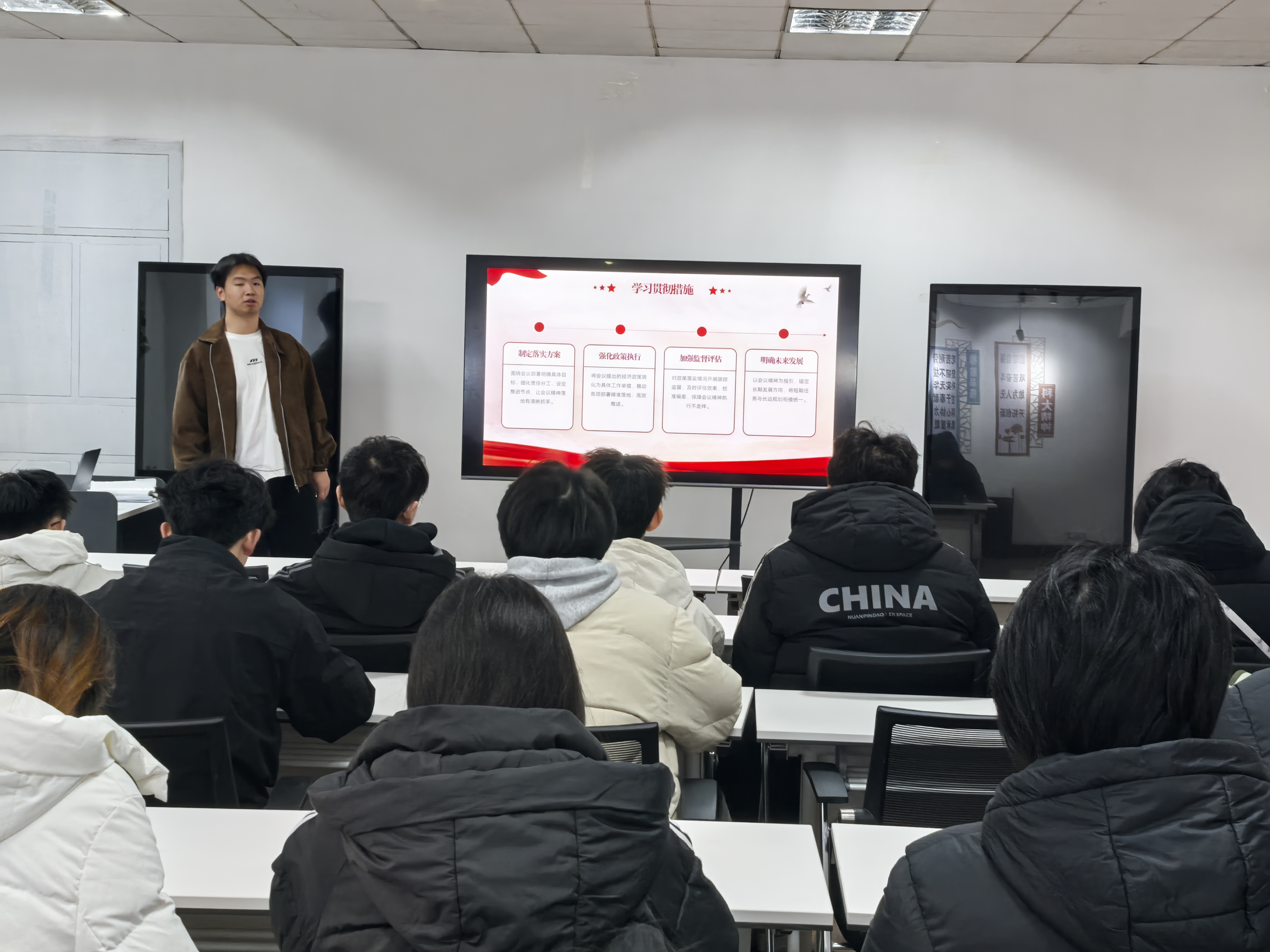 为落实党团班一体化建设部署,深化“三全育人”成效,12月18日,经管学院2024级金融专业以“一站式”学生社区为阵地,开展“强学风、明方向、促成长”系列活动。活动将中央经济工作会议精神学习与学风建设深度融合,充分发挥“党员引领、团员带头”作用,以主题实践践行学院“思政+专业”育人理念。
