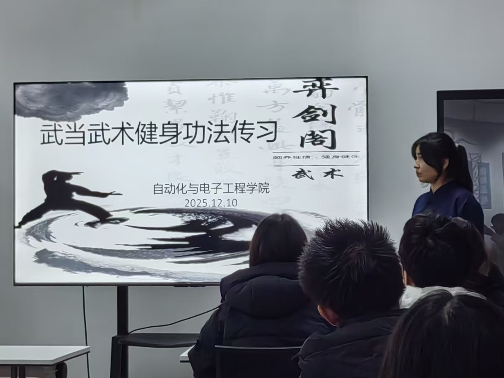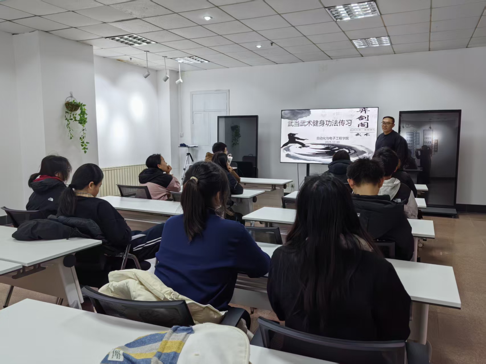为深入贯彻“三全育人、五育并举”人才培养战略,弘扬中华传统武术文化,引导学生在专注学业的同时关注身心健康。12月10日,自动化与电子工程学院在学校“一站式”学生社区举办“武当武术健身功法传习讲座”。讲座由学院辅导员李卓林主持,特邀学校弈剑阁武术协会负责人担任主讲,吸引了众多学生踊跃参与。