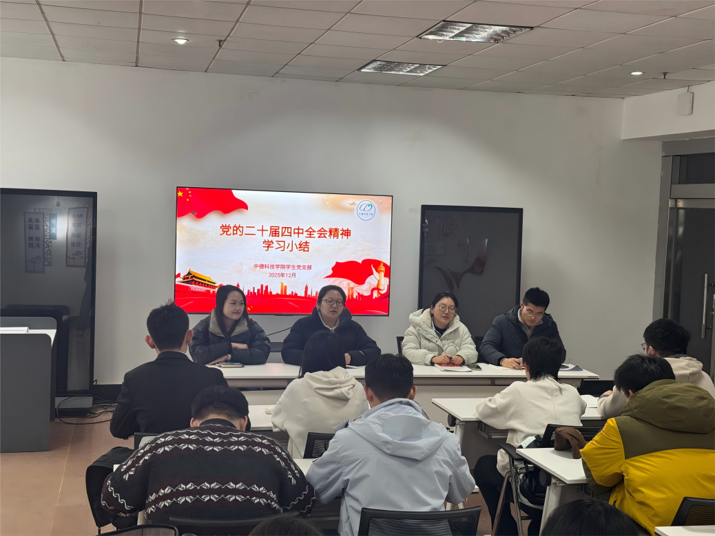 近日,中德科技学院学生党支部在“一站式”学生社区召开支部党员大会,组织开展党的二十届四中全会精神学习成果小结。会议由党支部书记李怡然主持,支部全体党员参加。