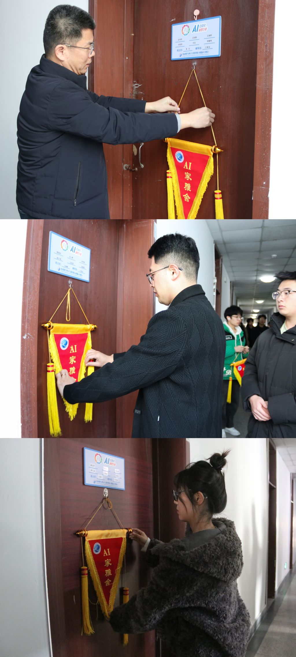 仪式结束后,师生一同移步至各宿舍,现场完成锦旗悬挂。一面面印有“AI家雅舍”字样的锦旗整齐悬挂于宿舍门口,成为楼道内一道亮丽的风景,也象征着自动化学院在宿舍文化建设与育人实践中的持续探索。