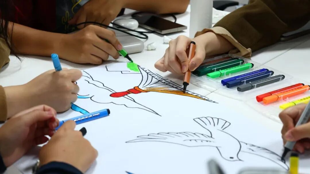画笔寄情,山河入画来。爱国主题艺术涂鸦创作现场气氛热烈,在场学生以笔墨绘初心,分小组密切配合、挥毫泼墨,将天安门、长城等象征国家精神的标志性景观跃然于长卷之上,色彩线条碰撞间一幅幅饱含对祖国祝福的作品渐次成型,再巧妙拼接,共同完成一幅气势恢宏的“盛世华诞”主题长卷,爱国情怀在笔墨间自然流淌,成为青春与祖国的生动对话。