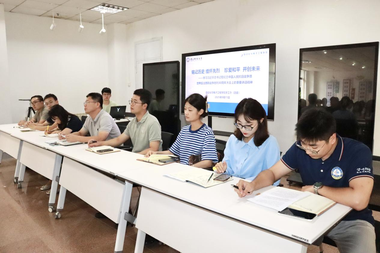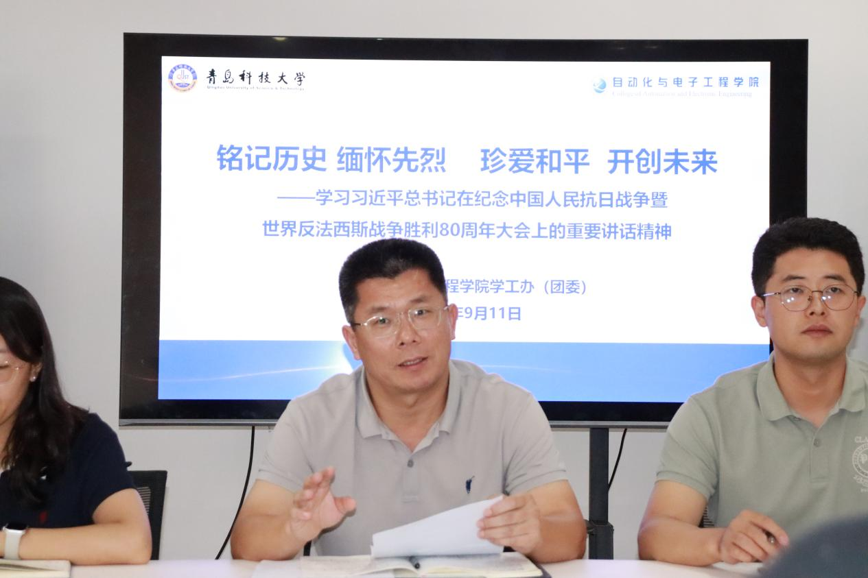 为纪念中国人民抗日战争暨世界反法西斯战争胜利80周年,提升团学干部队伍凝聚力与战斗力,9月11日,自动化与电子工程学院于崂山校区“一站式”学生社区组织学团骨干举办纪念中国人民抗日战争暨世界反法西斯战争胜利80周年主题活动。学院党委副书记兼副院长刘名森,辅导员张郁浩、徐文丽、马仁轩、李卓林、丁雅琼、董一凡及学团骨干40余人参加活动。活动由23级辅导员刘志飞主持。