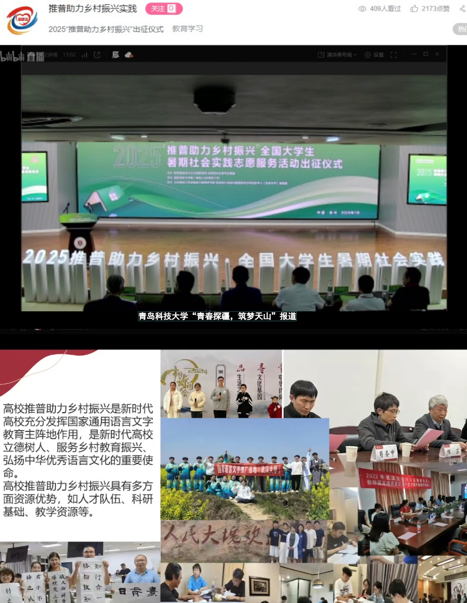 近日,教育部公布了2025年“推普助力乡村振兴”全国大学生暑期社会实践志愿服务活动入选团队名单,我院“青春探疆 筑梦天山”社会实践队从全国1680所高校的8013支团队中脱颖而出,成功入选重点团队。伟德国际1949官网“青春探疆 筑梦天山”社会实践队以“推普+”为核心创新实施十大主题板块活动,助力加大国家通用语言文字推广力度,积极服务乡村振兴战略,铸牢中华民族共同体意识,以实际行动为中国式现代化贡献青科大学子的青春力量。