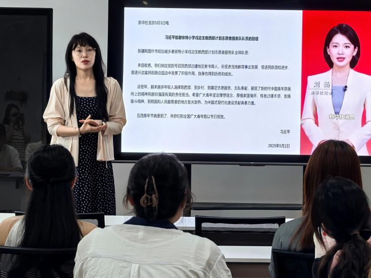 深学回信悟精神,砥砺奋进新征程。在谢依特回信精神专题学习活动中,经管学院组织学生研读回信原文,郝家玮以自身西部支教经历为例,深刻诠释专业知识与家国情怀结合的实践价值,对学生提出三点要求:一是要以“信仰之魂”筑牢思想根基,做立场坚定的“追光者”;二是要以“奋斗之姿”书写青春答卷,做知行合一的“实干家”;三是要以“品德之尺”丈量人生高度,做引领风尚的“先锋队”。学生围绕“如何将回信精神融入学习与生活”展开讨论,踊跃分享心得体会。学生表示,将以回信精神为指引,树立远大理想,提升专业素养,在时代浪潮中贡献经管智慧。