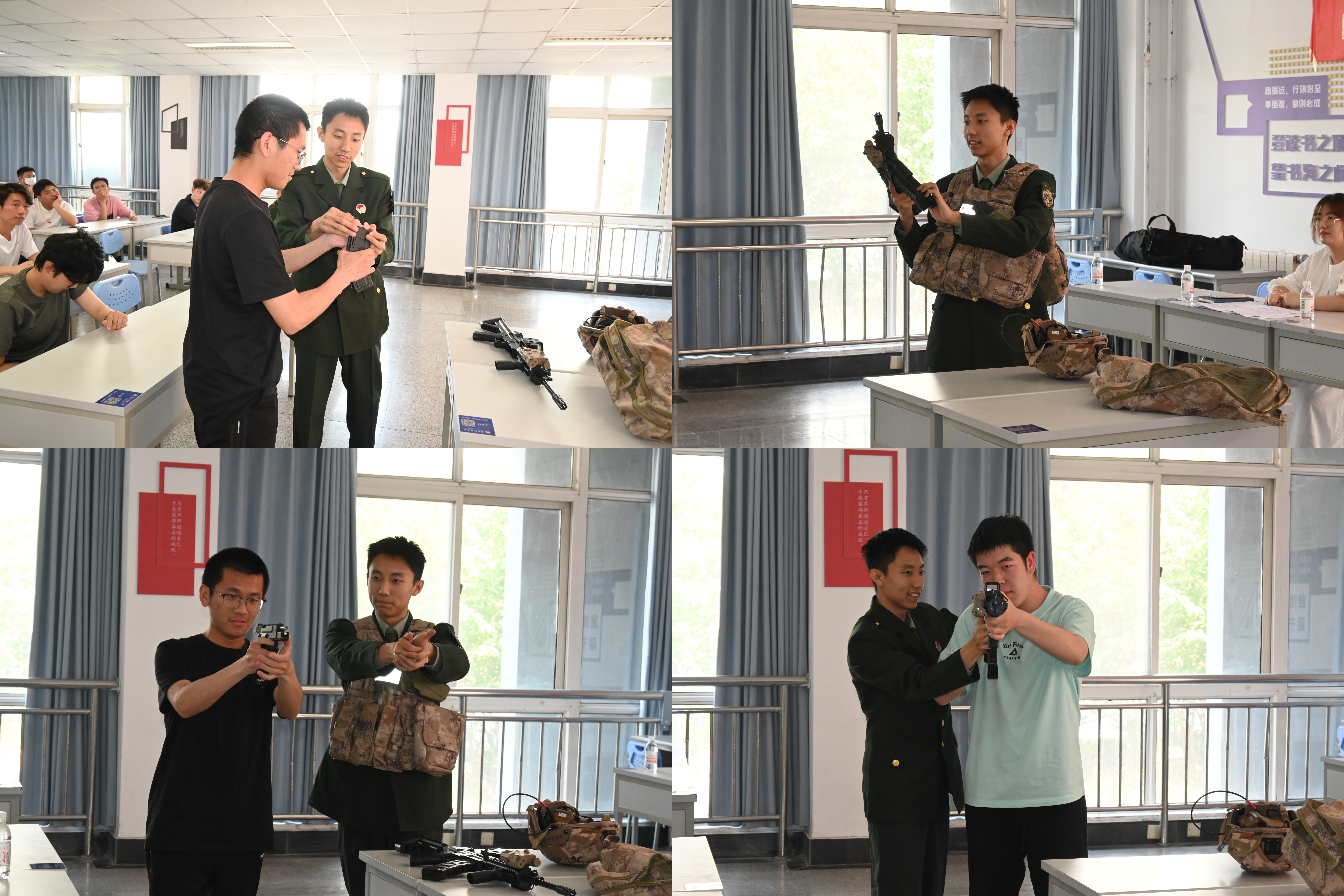 此次活动中,还邀请了学院5名退役大学生士兵以军事体验、政策宣讲与职业发展“三位一体”模式进行国防主题宣讲。来自四个年级的退役大学生士兵代表张伟民、丁宁、张培培、崔清成,结合自身军旅生活切片和重返校园后的成长故事,生动讲述了参军带来的成长与收获,具像化展现军事实践对新时代大学生的个人意志品质的淬炼。退役大学生士兵腾耀翔借助先进枪支模型作为教具,为同学带来一场生动的国防知识科普宣讲。手把手教大家体验模拟射击,讲授枪械知识,把一堂沉浸式军事理论体验课带到一站式学生社区。