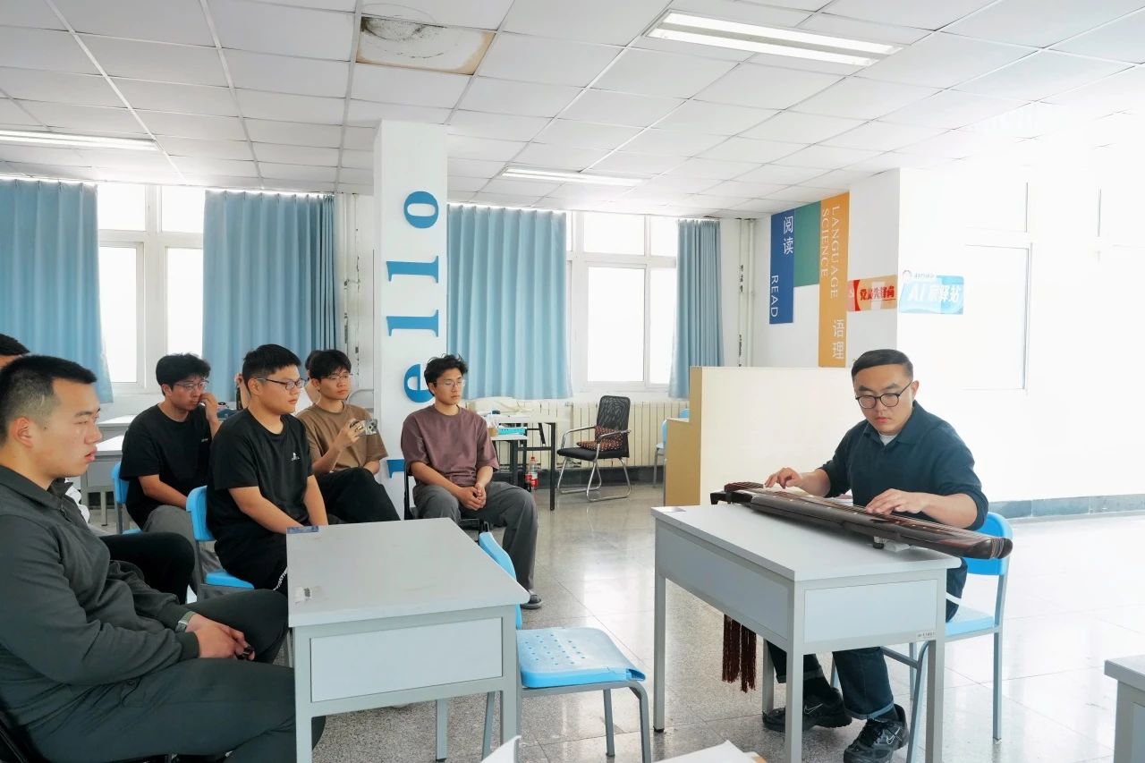 活动以“古琴漫谈”专题拉开帷幕。李卓林从古琴三千年的历史脉络讲起,结合《广陵散》《流水》等名曲典故,生动解析古琴“天人合一”的文化内涵。现场,他通过讲解古琴的形制构造、演示“散、泛、按”三种音色技法,让同学们直观感受“轻如松涛、沉若钟磬”的音韵之美。教学环节中,学生们轮流上手指点琴弦,在“抹、挑、勾、剔”的基础指法中体会音调变化规律,琴声流转间传递着青年一代对传统艺术的热情。