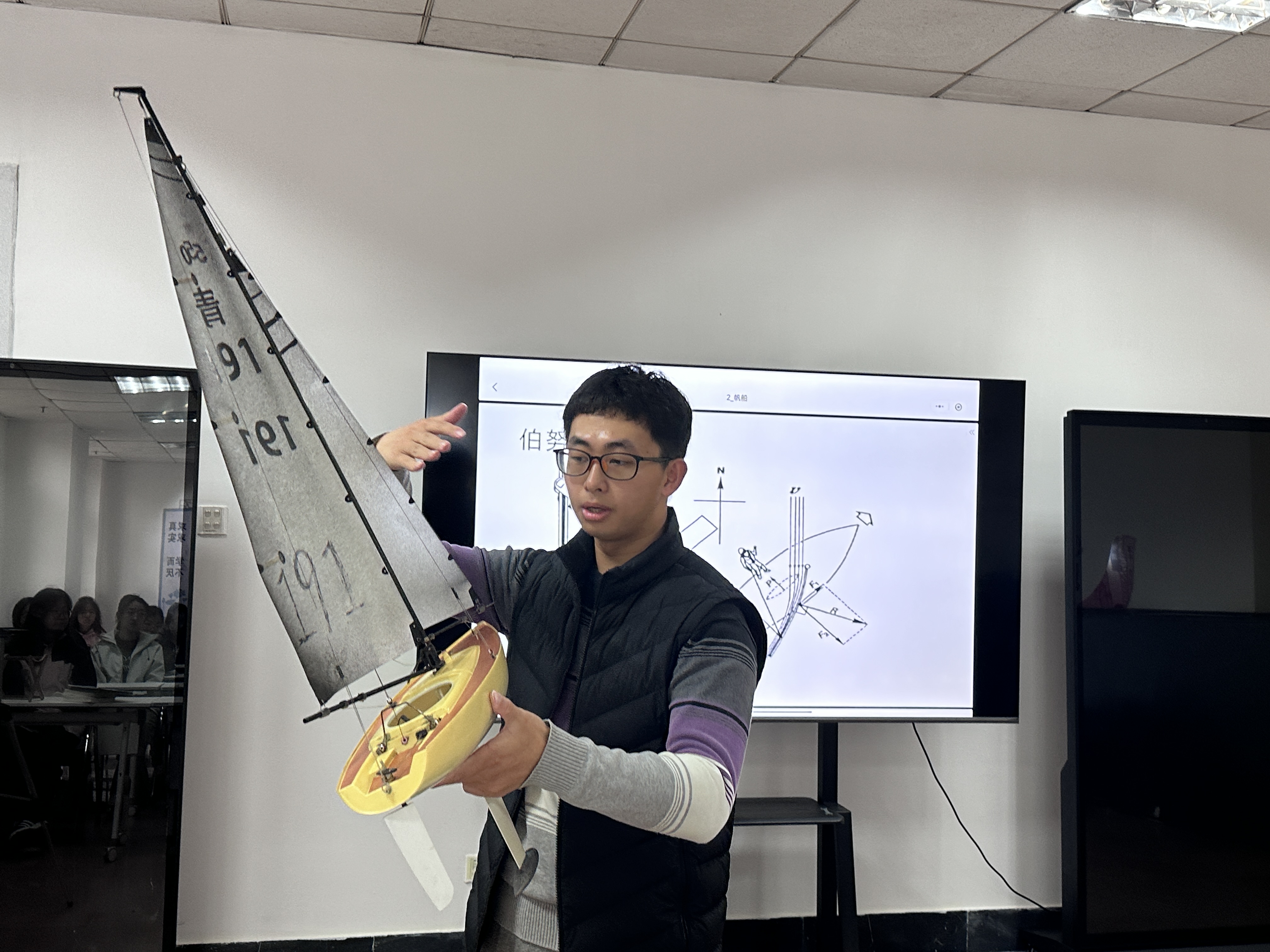 自大学入学以来,陈锦庚从帆船小白一路成长,从加入帆船俱乐部参加专业培训,到加入帆船队代表学校参加各类比赛,并作为校帆船队的一员在2023年中国大学生帆船联赛总决赛夺冠。从懵懂到专业,陈锦庚从自身经历出发,将帆船运动的历史发展、航行原理、竞赛规则等内容娓娓道来,为同学们揭开了帆船世界的神秘面纱。他说到,帆船运动不仅是一项体育竞技活动,更是一种人与自然和谐共处的生活方式。通过控制风帆,利用自然风力前行,增强了个人的航海技能,锻炼了个人意志力和团队合作精神。帆船运动展现了人类面对自然时顽强抗争、永不服输的精神,对于当代大学生的身体素质教育和精神磨炼起到了非常重要的作用。