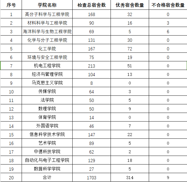 为进一步加强学生宿舍内务卫生和安全文明创建,强化学生宿舍安全意识,营造一个安全舒适、整洁优雅、文明和谐的宿舍环境。4月10日,学生工作处、研究生院、保卫处、后勤管理处及各学院开展了学生宿舍卫生安全秩序大检查。本次共抽查宿舍1703间,经统计,优秀宿舍314间,合格宿舍1379间,不合格宿舍9间。