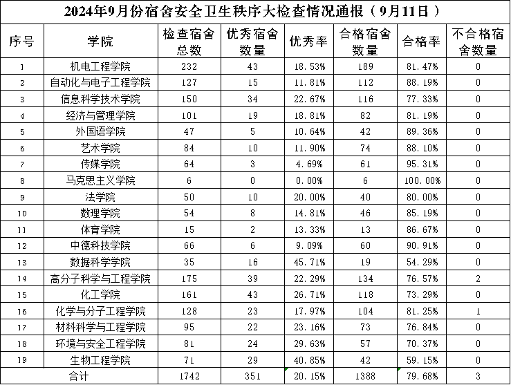 为持续做好新学期宿舍文明建设,打造“平安、健康、文明、和谐”的宿舍环境,展现清爽、整洁的宿舍新面貌,911日,学生工作处、后勤管理处、安全管理处及各学院联合开展了9月份学生宿舍安全卫生秩序大检查。本次共抽查宿舍1742间,经统计,优秀宿舍351间(名单见附件),合格宿舍1388间,不合格宿舍3间。(混合宿舍按照所属学院分别计入检查结果中)。