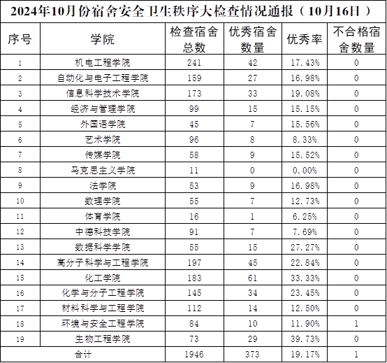 为进一步排查整治宿舍安全隐患,持续做好宿舍文明建设,打造“平安、健康、文明、和谐”的宿舍环境,10月16日,学生工作处、后勤管理处、安全管理处及各学院联合开展了10月份学生宿舍安全卫生秩序大检查。本次共抽查宿舍1946间,经统计,优秀宿舍373间(名单见附件),合格宿舍1572间,不合格宿舍1间。(混合宿舍按照所属学院分别计入检查结果中)。