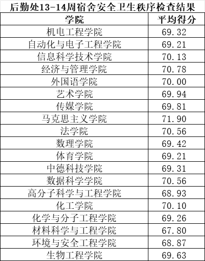 根据学校工作安排,后勤管理处组织公寓管理人员开展崂山、四方校区13-14周宿舍安全卫生秩序检查。本次共检查宿舍5630间,经统计,合格及以上宿舍5387间,不合格宿舍243间。各学院平均得分如下所示。