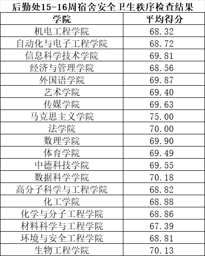 根据学校工作安排,后勤管理处组织公寓管理人员开展崂山、四方校区15-16周宿舍安全卫生秩序检查。本次共检查宿舍5475间,经统计,合格及以上宿舍5149间,不合格宿舍326间。各学院平均得分如下所示。