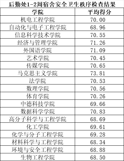 根据学校工作安排,后勤管理处组织公寓管理人员开展崂山、四方校区1-2周宿舍安全卫生秩序检查。本次共检查宿舍5304间,经统计,合格及以上宿舍5113间,不合格宿舍191间。各学院平均得分如下所示。