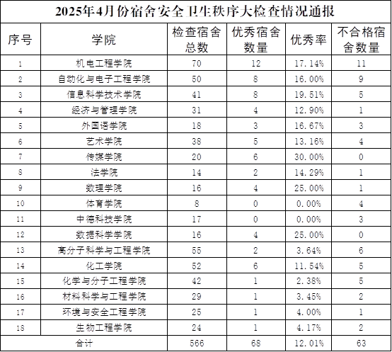 为营造健康、安全、温馨、整洁的居住环境,进一步守护学生安全安康、助力学生成长成才,根据学校进一步加强学生宿舍建设的整体安排,学生工作处、后勤管理处、安全管理处、校团委组建联合检查组于4月16日—17日开展了4月份学生宿舍安全卫生秩序大检查。本次共抽查宿舍566间,经统计,优秀宿舍68间(名单见附件),合格宿舍435间。(混合宿舍按照所属学院分别计入检查结果中)。