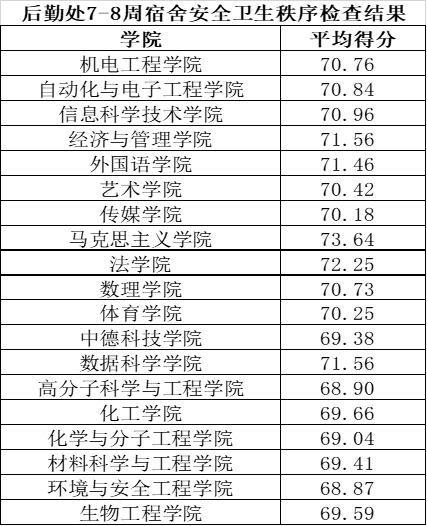 根据学校工作安排,后勤管理处组织公寓管理人员开展崂山、四方校区7-8周宿舍安全卫生秩序检查。本次共检查宿舍5471间,经统计,合格及以上宿舍5351间,不合格宿舍120间。各学院平均得分如下所示。