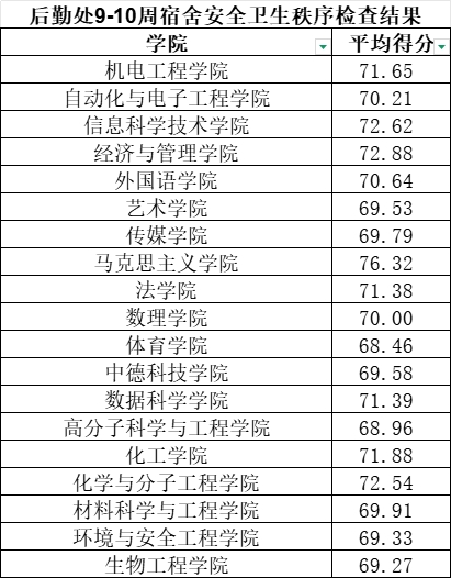 根据学校工作安排,后勤管理处组织公寓管理人员开展崂山、四方校区9-10周宿舍安全卫生秩序检查。本次共检查宿舍4760间,经统计,合格及以上宿舍4592间,不合格宿舍168间。各学院平均得分如下所示。