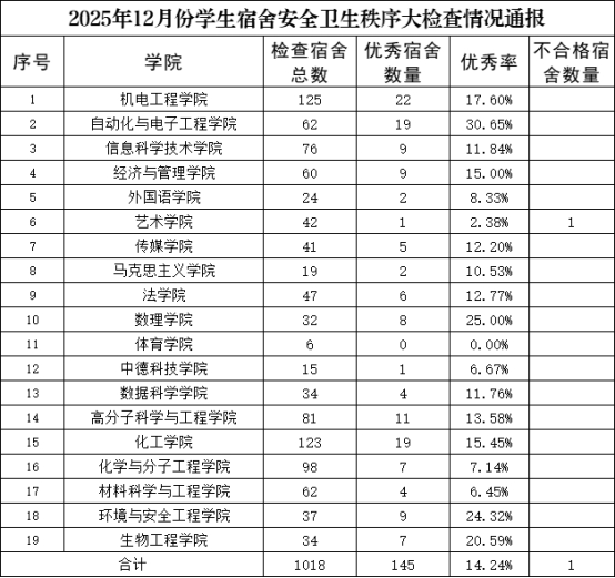 2025年12月份学生宿舍安全卫生秩序大检查情况通报