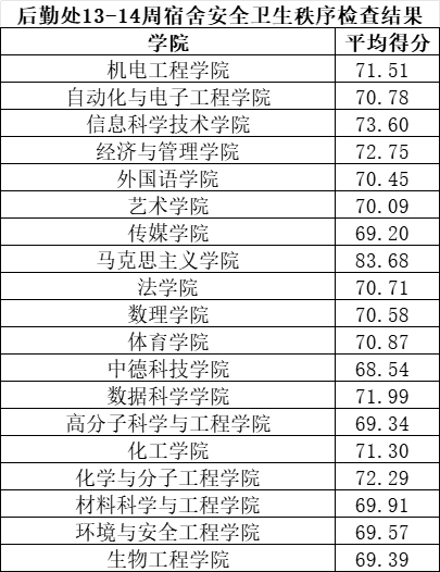 根据学校工作安排,后勤管理处组织公寓管理人员开展崂山、四方校区13-14周宿舍安全卫生秩序检查。本次共检查宿舍4668间,经统计,合格及以上宿舍4534间,不合格宿舍134间。各学院平均得分如下所示。