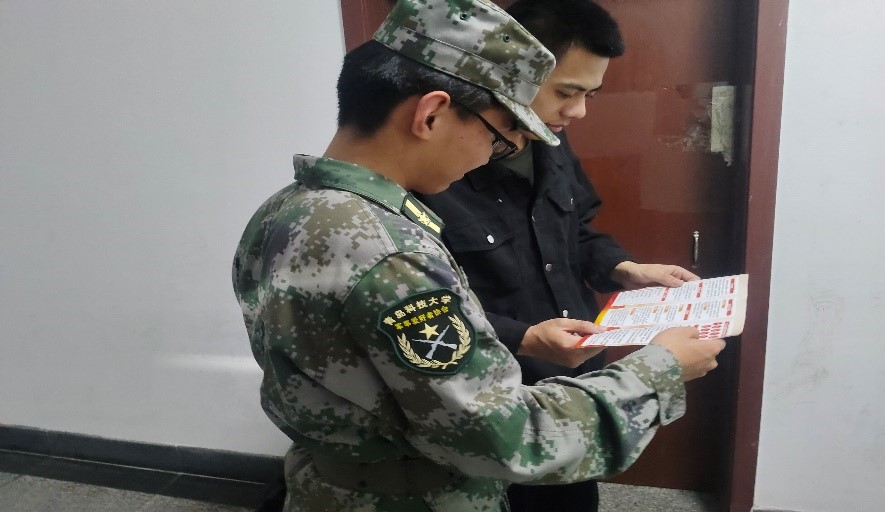 辅导员和军事爱好者协会成员骨干发放征兵宣传手册,讲解2024年征兵政策,重点就参军服役的入伍条件、报名流程及体检时间等作了详细解读,并为有疑问的同学积极解答相关问题。