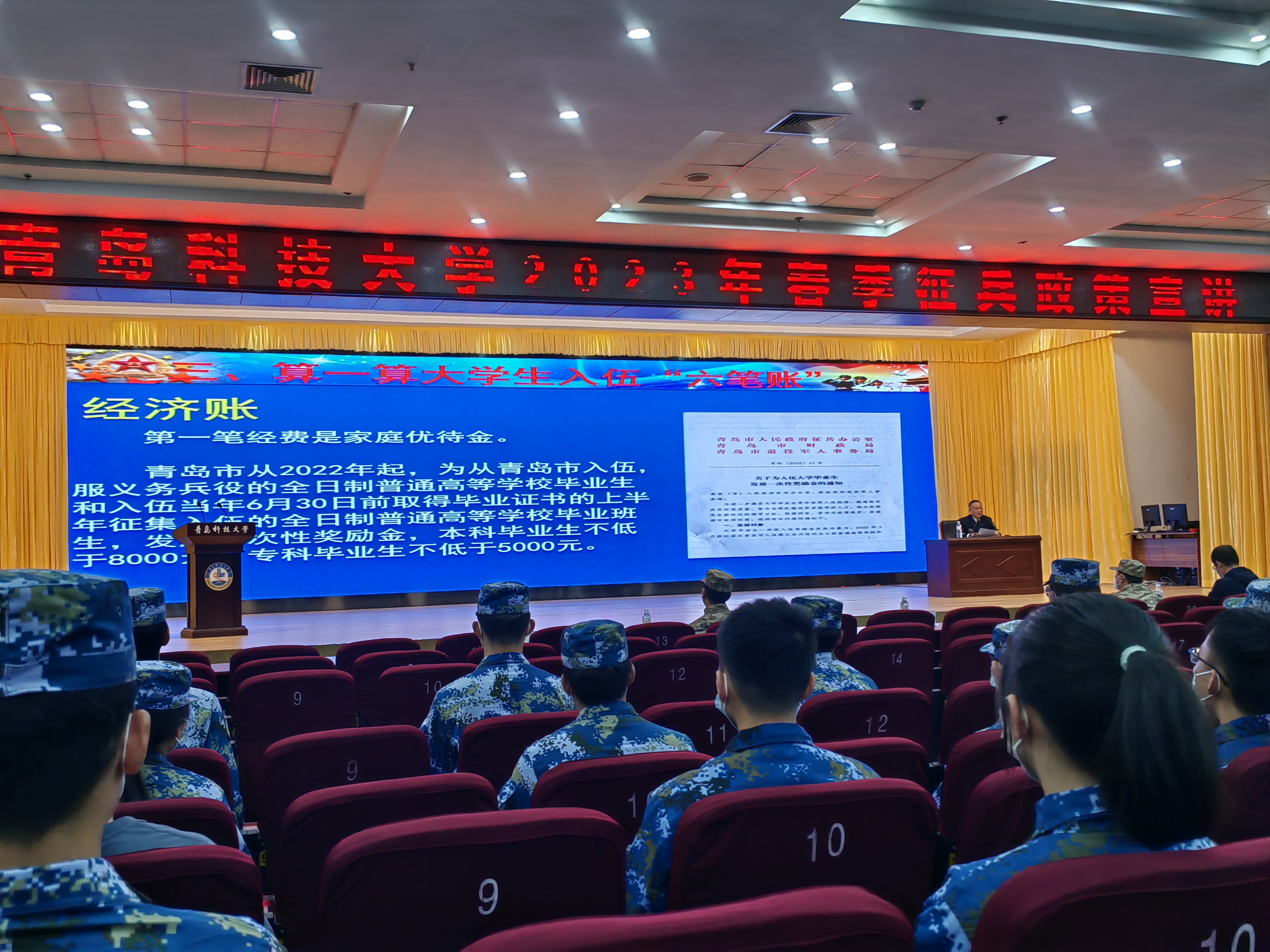 11月29日下午,11月29日下午,伟德官网2023年春季征兵政策宣讲会在崂山校区第二报告厅举行。市北区武装部部长张庆龙、副部长刘伟杰、军事科长赵云飞入校开展征兵宣讲,学校武装部全体参加。宣讲采取线上线下相结合的形式进行,崂山校区有入伍意愿部分学生代表到现场观看宣讲,学校共有1706名入伍意愿的学生在线上收看了宣讲,宣讲会由武装部副部长曹永俊主持。