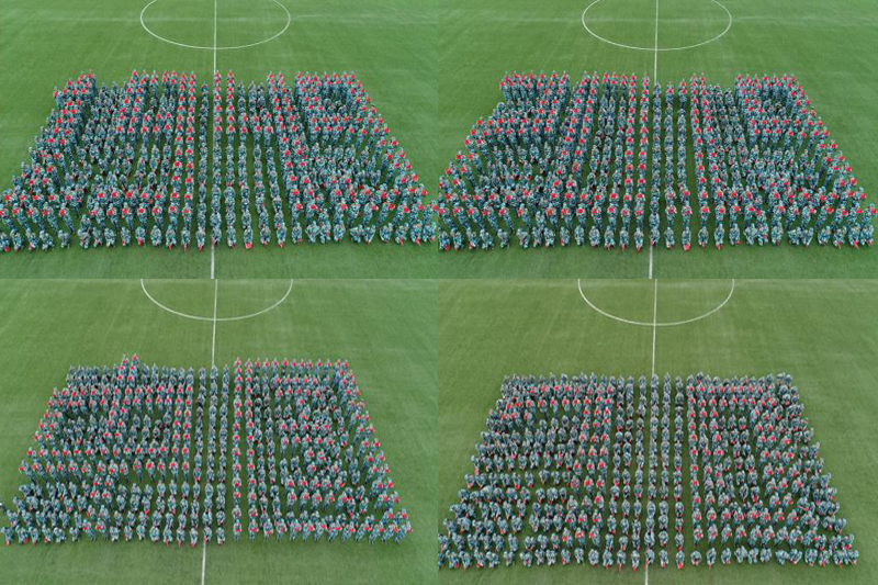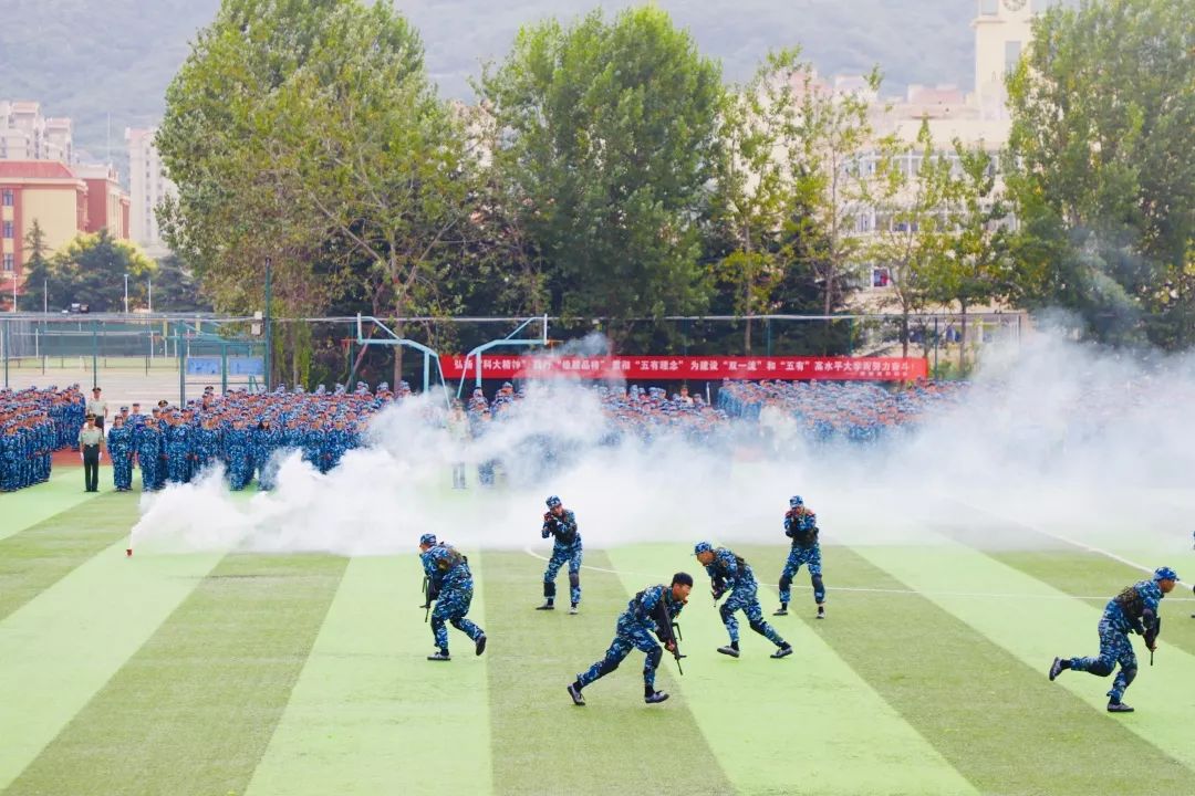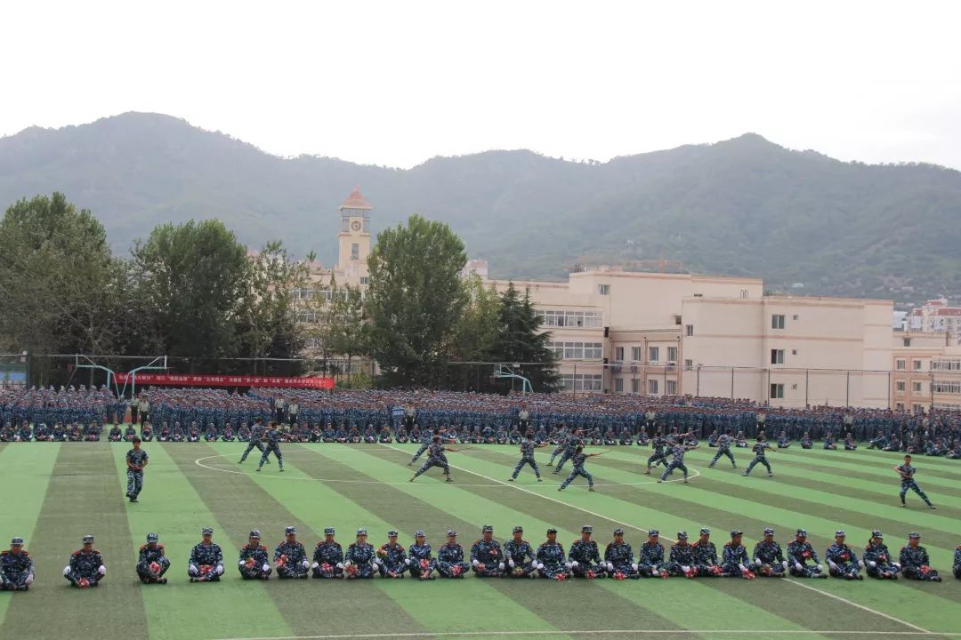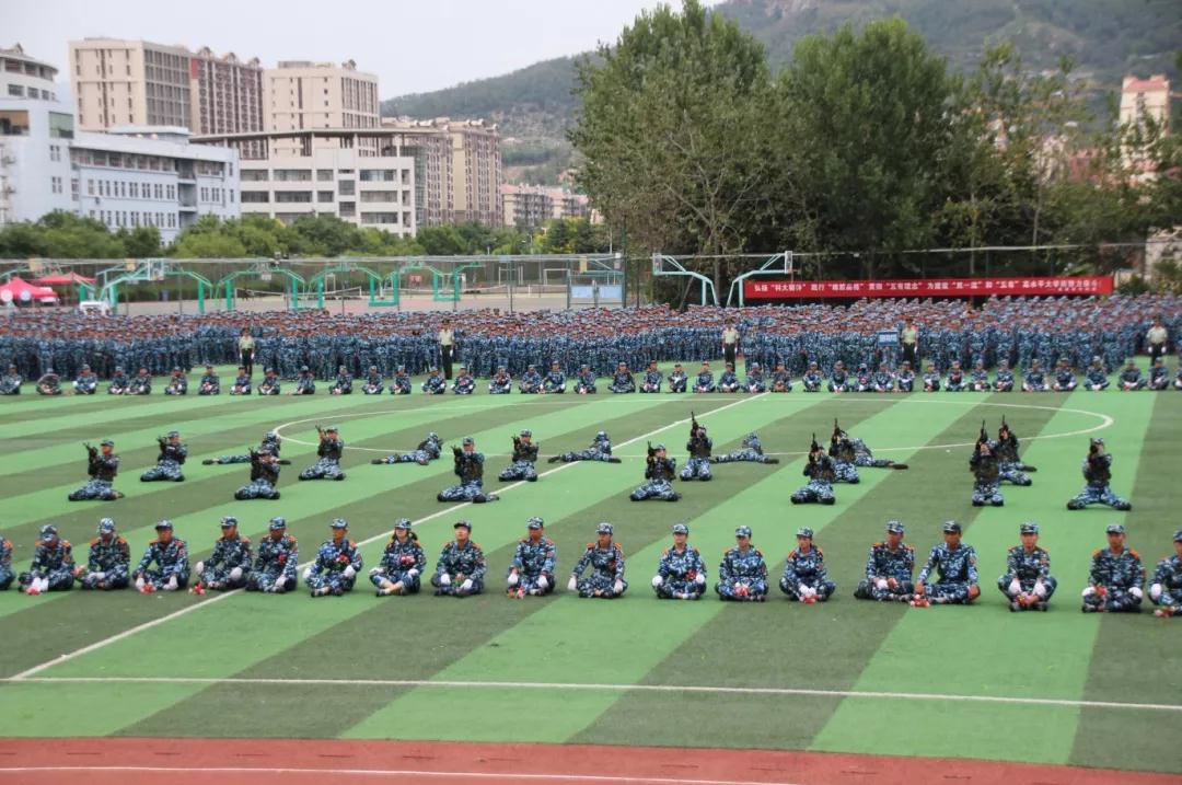 军训一团先进行了军警用棍术、持枪行进间战术动作以及分队队形变换等军训项目汇报,而后进行了军歌、校歌合唱,同学们手持鲜花,摆出“70”字形,用嘹亮的歌声表达对新中国成立70周年美好的祝福。军训二团,首先进行的是男子军体拳表演,他们动作整齐一致、出拳虎虎生威,踢脚凌厉有力,喊着整齐响亮的口号,个个精神抖擞,展现出军人般的英姿与威武。接下来的海军旗语表演、劈枪方队表演,都赢得了现场热烈掌声。军训三团,应急棍术方队100名新生同学进行了应急棍术汇报表演,应急棍术”精彩纷呈,只见同学们架踢劈击、抡扫摔击、势若疾风,将整套棍术演绎的有如行云流水,展现了当代大学生良好的精神风貌。军歌方队合唱了《强军战歌》,并摆出了1949、2019和70等图形字样,用独特的方式向新中国成立70周年献礼。高密校区新进教师组成一个方队。军训四团进行了队列动作、队形变换、方队所有训练科目的汇报表演。