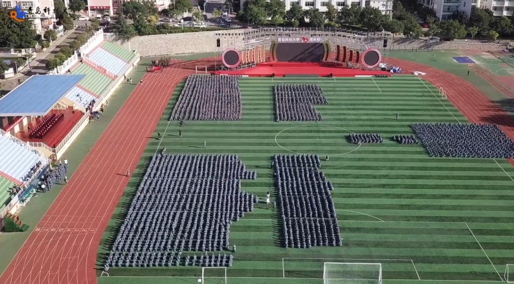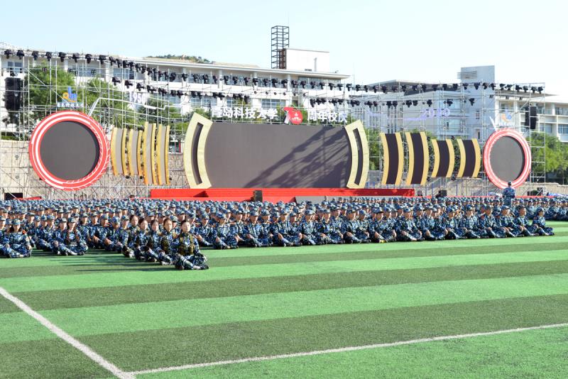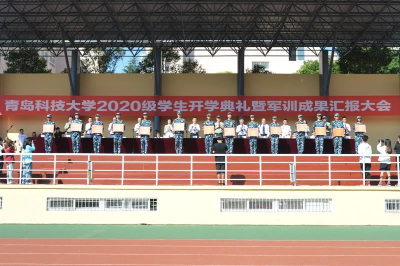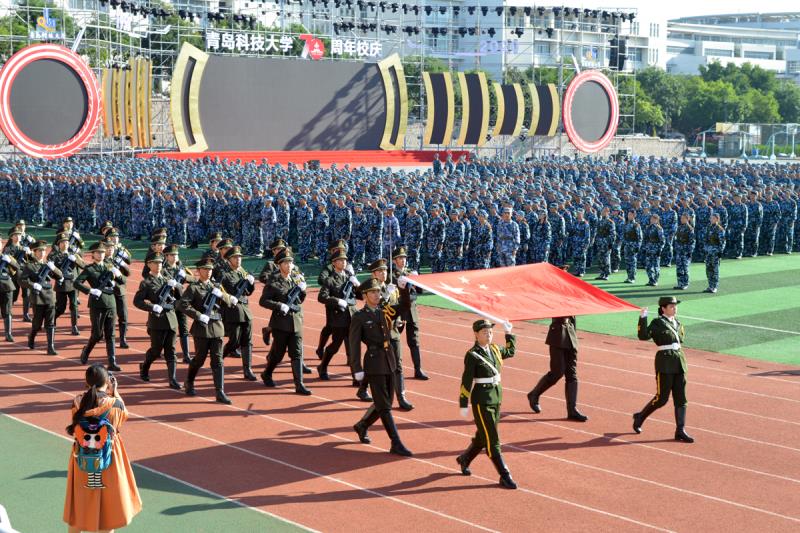 机电学院付平、化学院于跃芹、中德工程学院李笋、自动化学院副院长兼高密校区自动化系主任刘慧明作为教师代表发言。在校生代表经管学院张洲卉、海洋学院杨靖雪、中德工程学院程福星、高密校区魏中雪,新生代表信息学院苟文迪、高分子学院孙铭璞、中德工程学院王彦杰、高密校区郑超元分别发言。在此次军训成果汇报中,先后进行了刺杀操、军体拳、擒敌、分队战术、战场医疗救护、匕首操、应急棍术等训练科目演练,军训方队展开巨幅校徽和校庆标识向70周年校庆献礼。学校相关职能部门负责人,各学院、校区负责人参加大会。