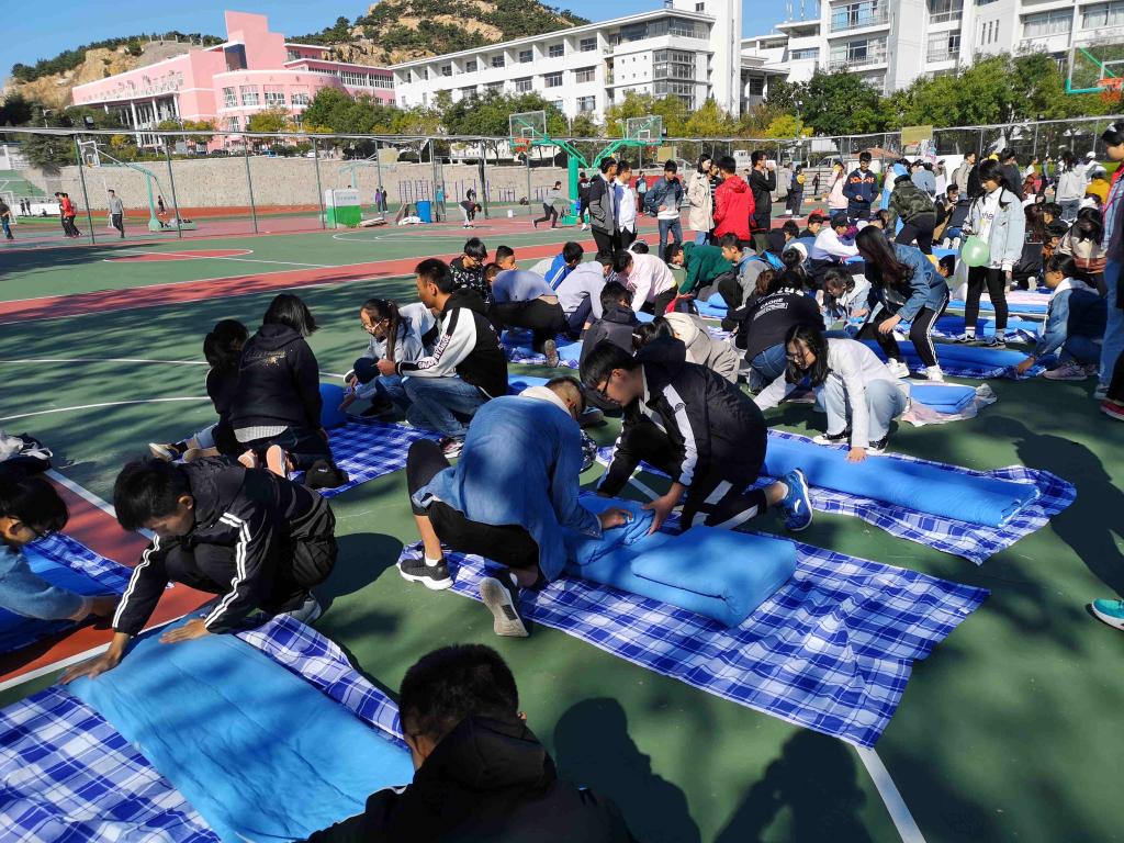 随着裁判的一声令下,趣味运动会开始,首先是两个人背靠背夹气球,到达终点后与在终点的同学击掌,接力同学旋转五圈,跨越障碍,与等在终点的同学一起把拆掉被罩的被子装好,并返回起点。比赛有条不紊的进行,紧张而又欢乐的氛围充满赛场。趣味运动会结束后,进入本次活动主题——叠军被。