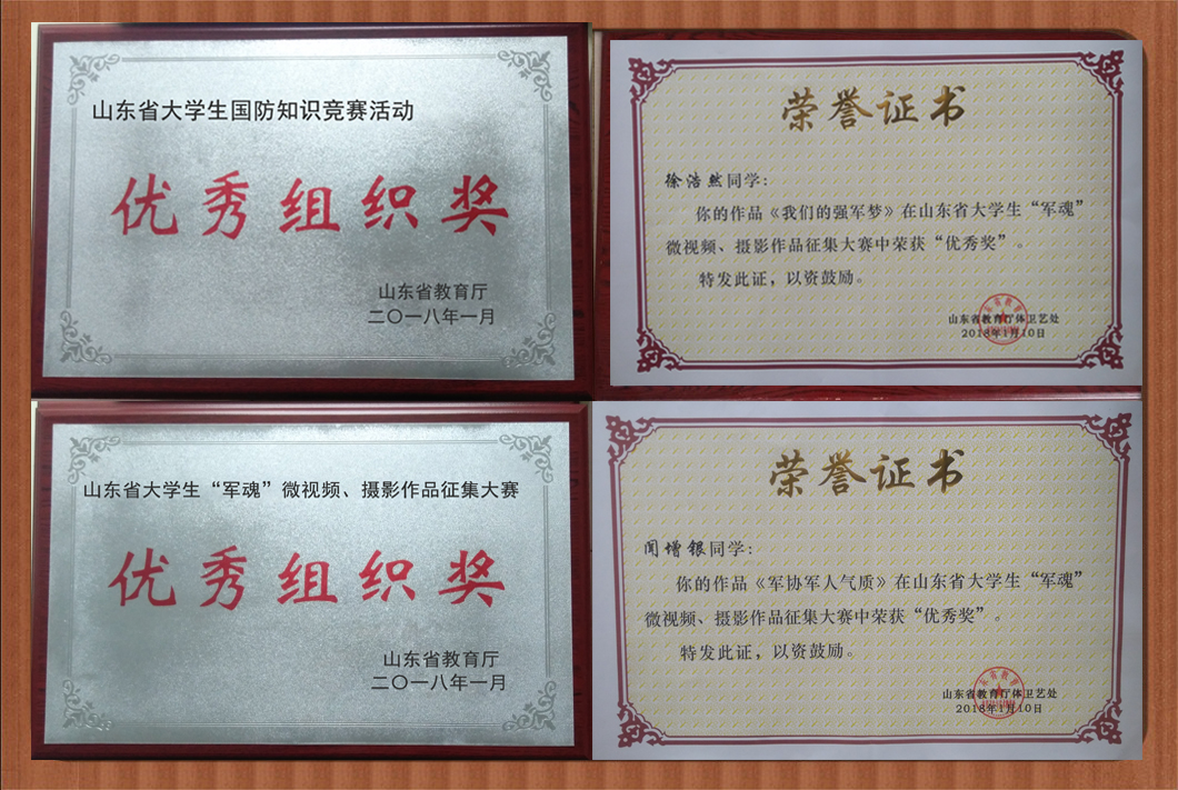 日前,山东省国防教育协会年会在烟台举行,会上对2017年度全省学校国防教育活动进行了表彰,伟德官网多项活动获奖:1、山东省学校国防教育知识竞赛优秀组织奖,2、山东省大学生“军魂”微视频、摄影作品征集大赛优秀组织奖,3、《我们的强军梦》获微视频类作品优秀奖,4、《军协军人气质》获摄影类作品优秀奖。