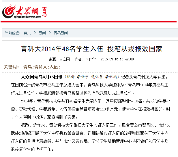 【大众网】青科大2014年46名学生入伍 投笔从戎报效国家