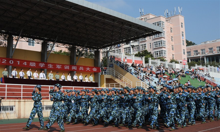 2014级学生军训从9月10日始至9月20日结束,期间进行了队列训练、内务训练、国防教育、消防安全教育等科目的学习。
