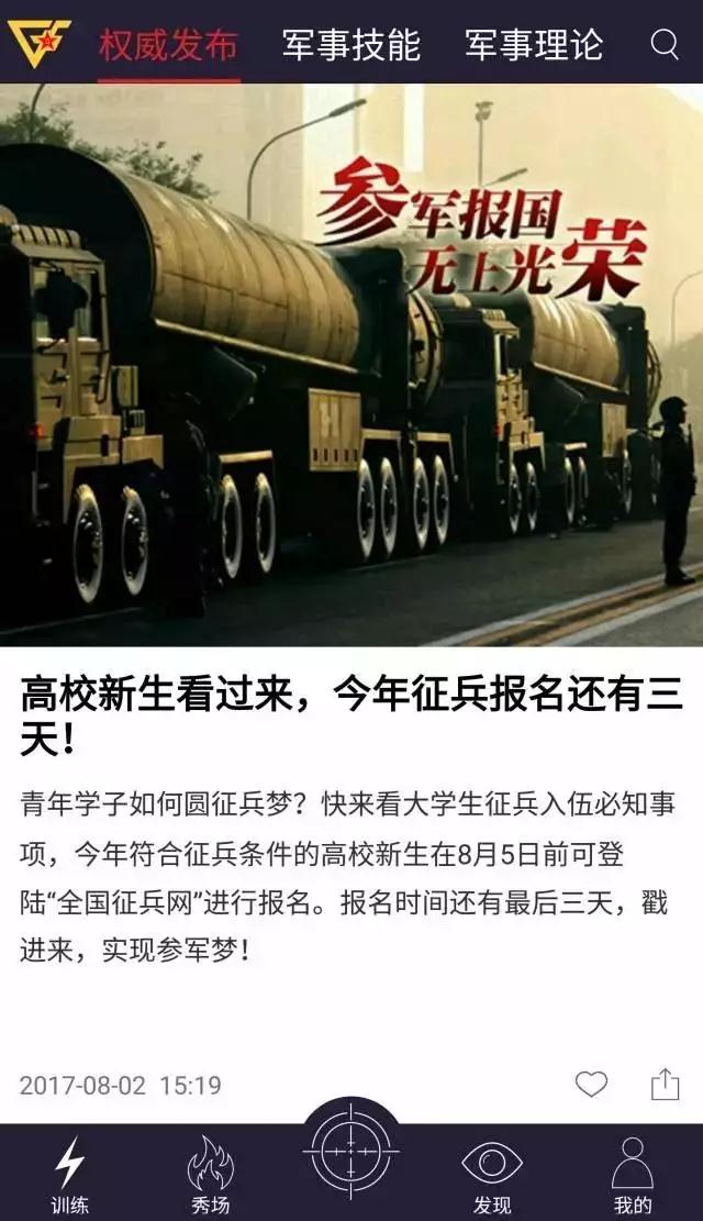 也就是说,大家可以通过app实时了解军训权威信息和动态,还可以通过app学习军训技能、分享学习心得,真可谓是新生的大福利啊!