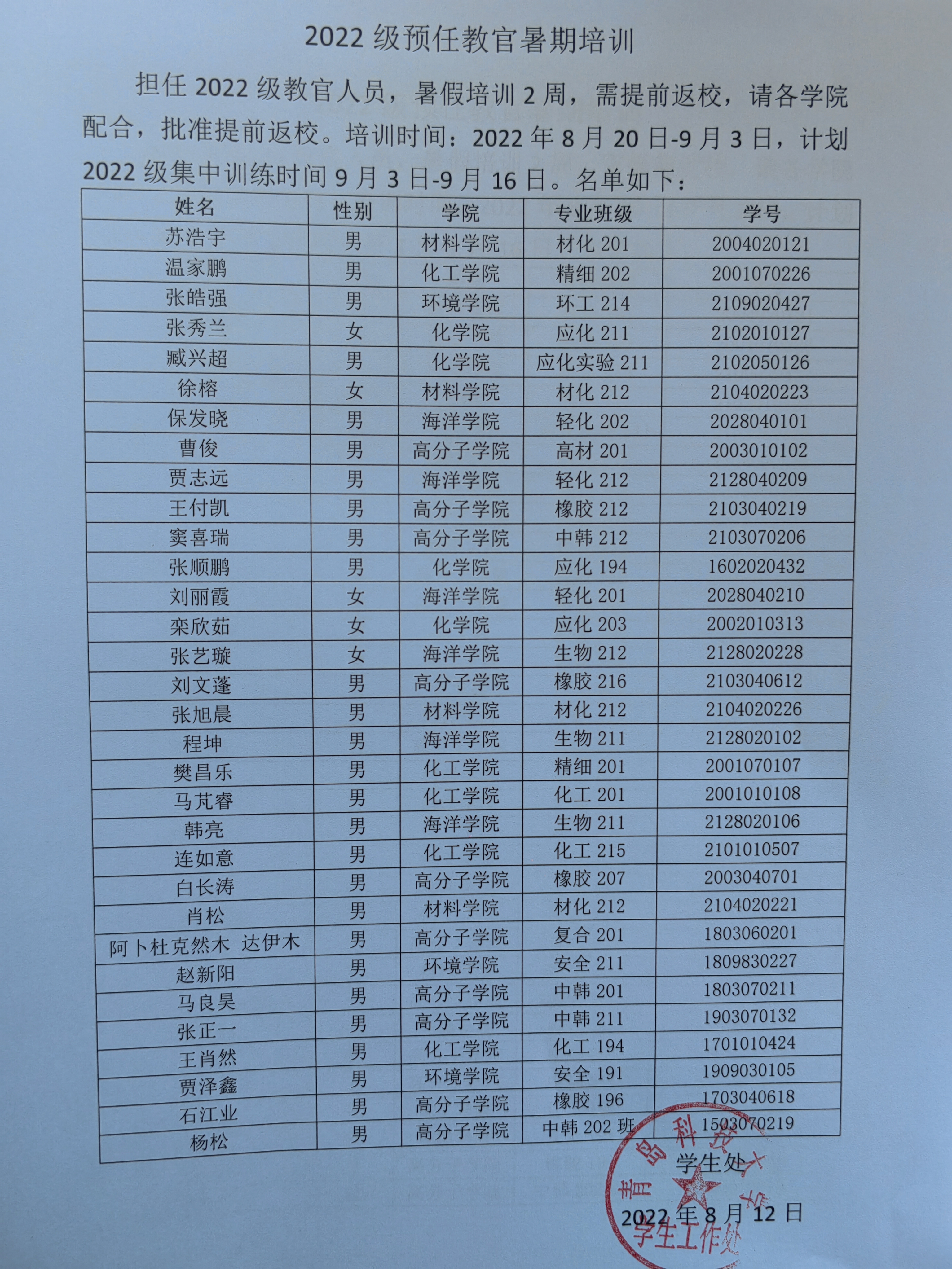 为了我校2022年军训工作顺利开展,武装部在暑假对担任2022级预任教官的同学进行培训2周,需提前返校,请各学院批准学生教官提前返校。培训时间:2022820-93日,计划2022级集中训练时间93-916日。