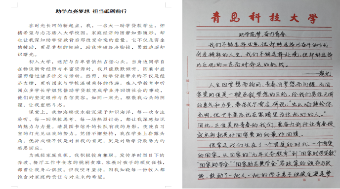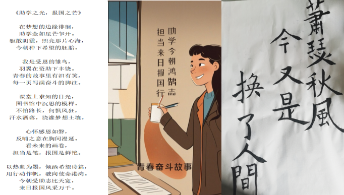 在作品征集过程中,同学们积极参与,用各种形式描绘自己的青春奋斗故事。有的同学通过征文和诗歌,以细腻的文字展现自己在接受资助后的心路历程和奋斗决心;有的同学精心制作插图,用五彩的电子画笔勾勒出自己对未来的憧憬和对国家资助政策的感恩之情;还有的同学以苍劲有力的毛笔字,书写出自己的鸿鹄之志。每一份作品都饱含着同学们真挚的情感,充分体现了新一代大学生的感恩意识、反哺意识和昂扬风采。