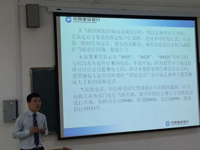 中国建设银行四方支行专业人员详细解读了征信的基本概念,诚信、信用与征信之间的区别与联系,身边的征信系统,大学生如何建立个人信用记录以及信用缺失的恶果等征信知识,并结合真实案例生动讲解了诚信还贷、珍爱个人信用的重要性和必要性,教育学生要树立诚信意识,关注和维护自己的信用记录。并通过生动的PPT展示、细致风趣的语言和典型案例的分析讲解了“校园贷”和“网络借贷诈骗”等常见校园诈骗方式,总结了这些案件的特点及作案手段,提醒学生们注意识别网络金融诈骗。