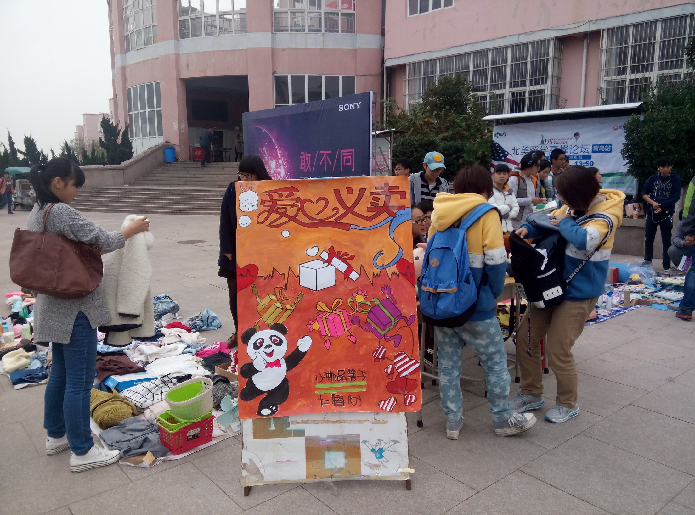 115日,伟德国际1949官网部分学生在崂山校区南苑食堂前举行“小物品等于大爱心”爱心义卖活动。