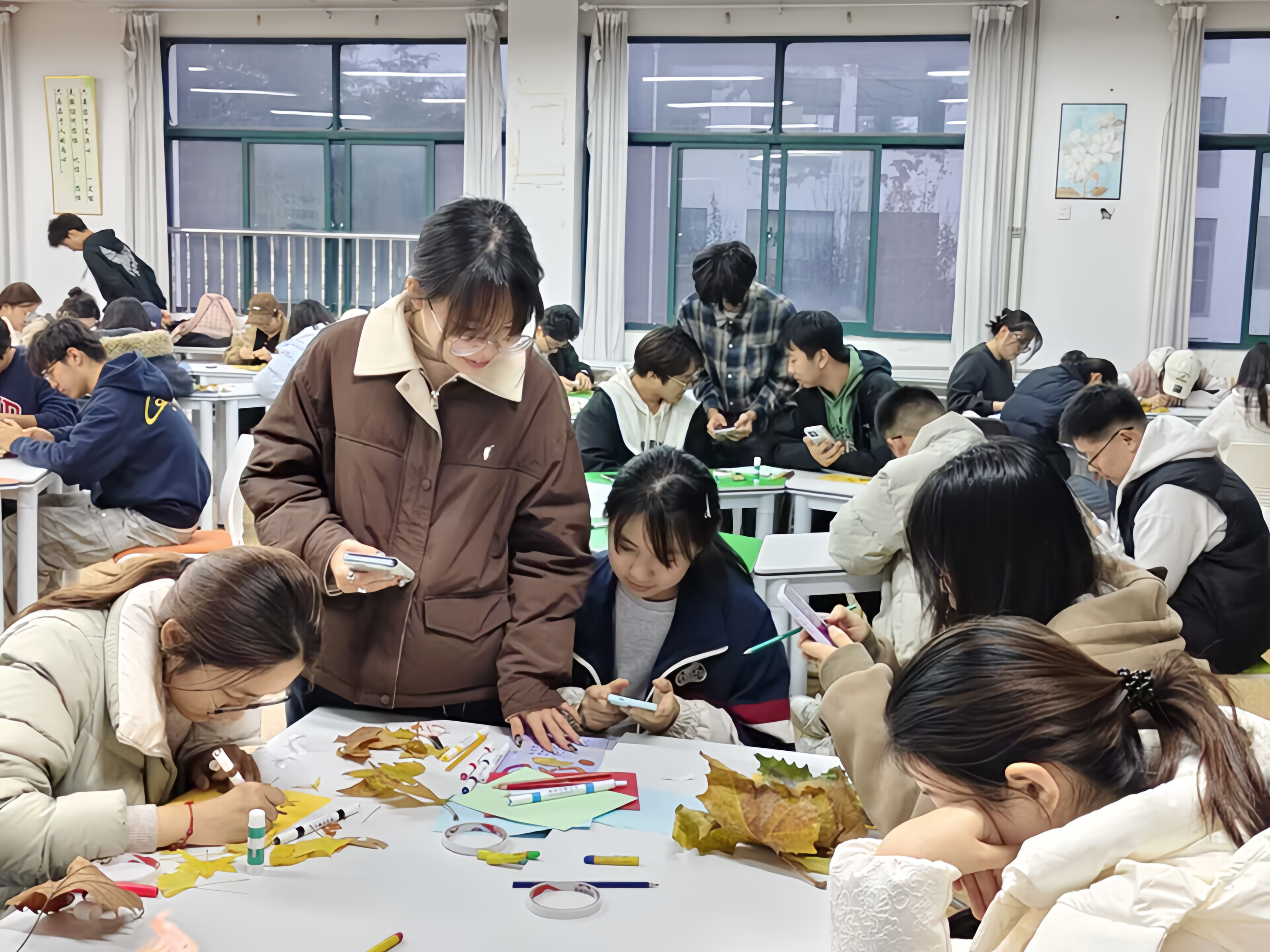 十一月初,“秋韵凝叶,岁月留痕” 树叶日历制作活动在高密校区心理工作站 201 教室顺利开展。活动现场,主持人详细讲解活动规则与创作技巧后,同学们充分发挥想象力与创造力,将精心收集的秋叶剪裁拼贴,辅以彩笔勾勒、文字注解,在日历页上圈注成长节点、书写青春感悟、镌刻未来期许,制作出一本本独一无二的创意日历。此次活动让同学们在动手创作中释放压力、陶冶情操,更将秋日诗意与校园生活深度融合,让季节之美在笔尖流淌、在心田驻足。