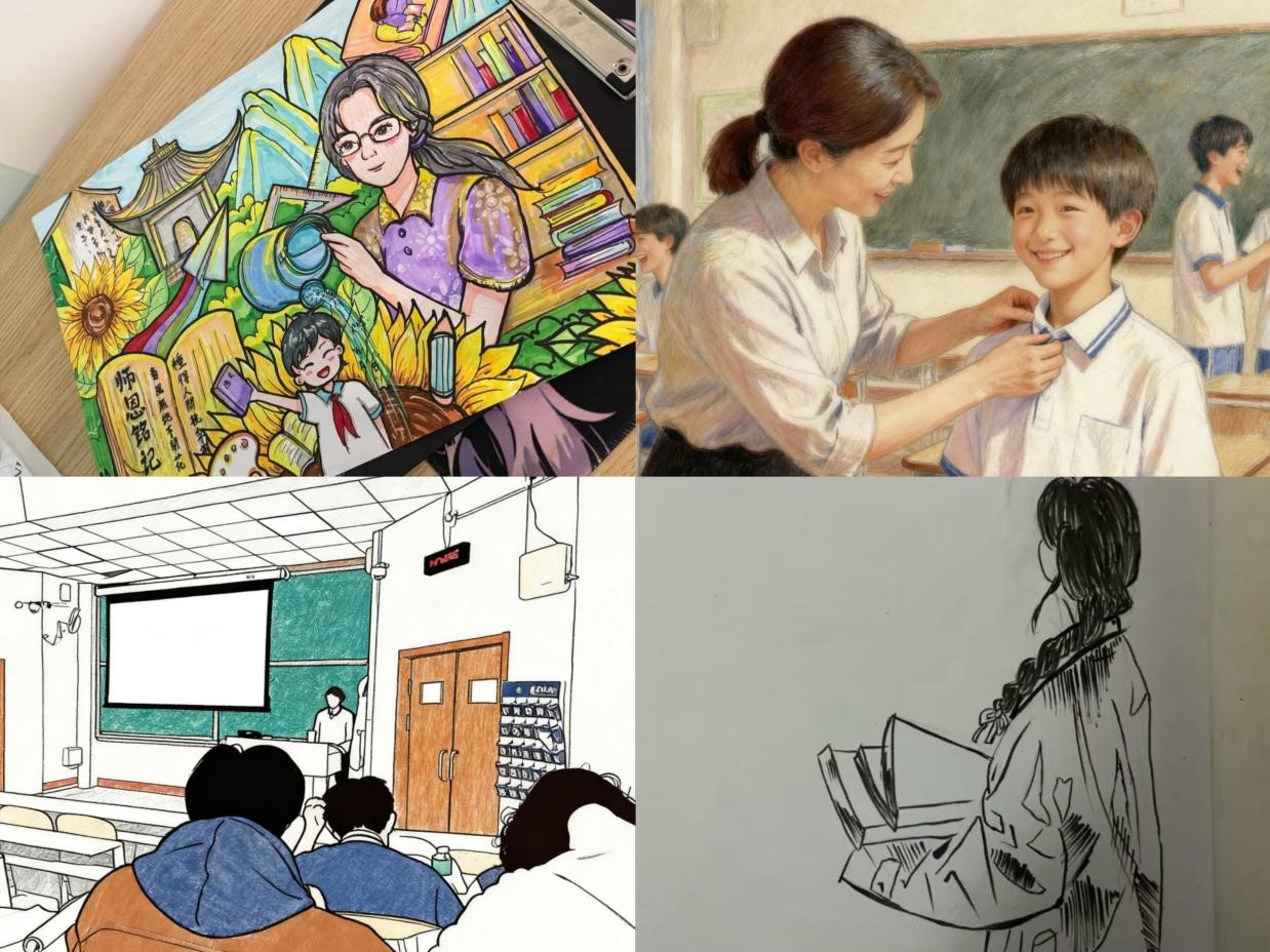活动第三项为“我画笔下的老师”绘画线上投稿,同学们通过手绘、板绘等形式,将老师的课堂风采、师生互动等场景转化为图画,展现学生眼中的师者形象,表达对老师真挚的谢意。