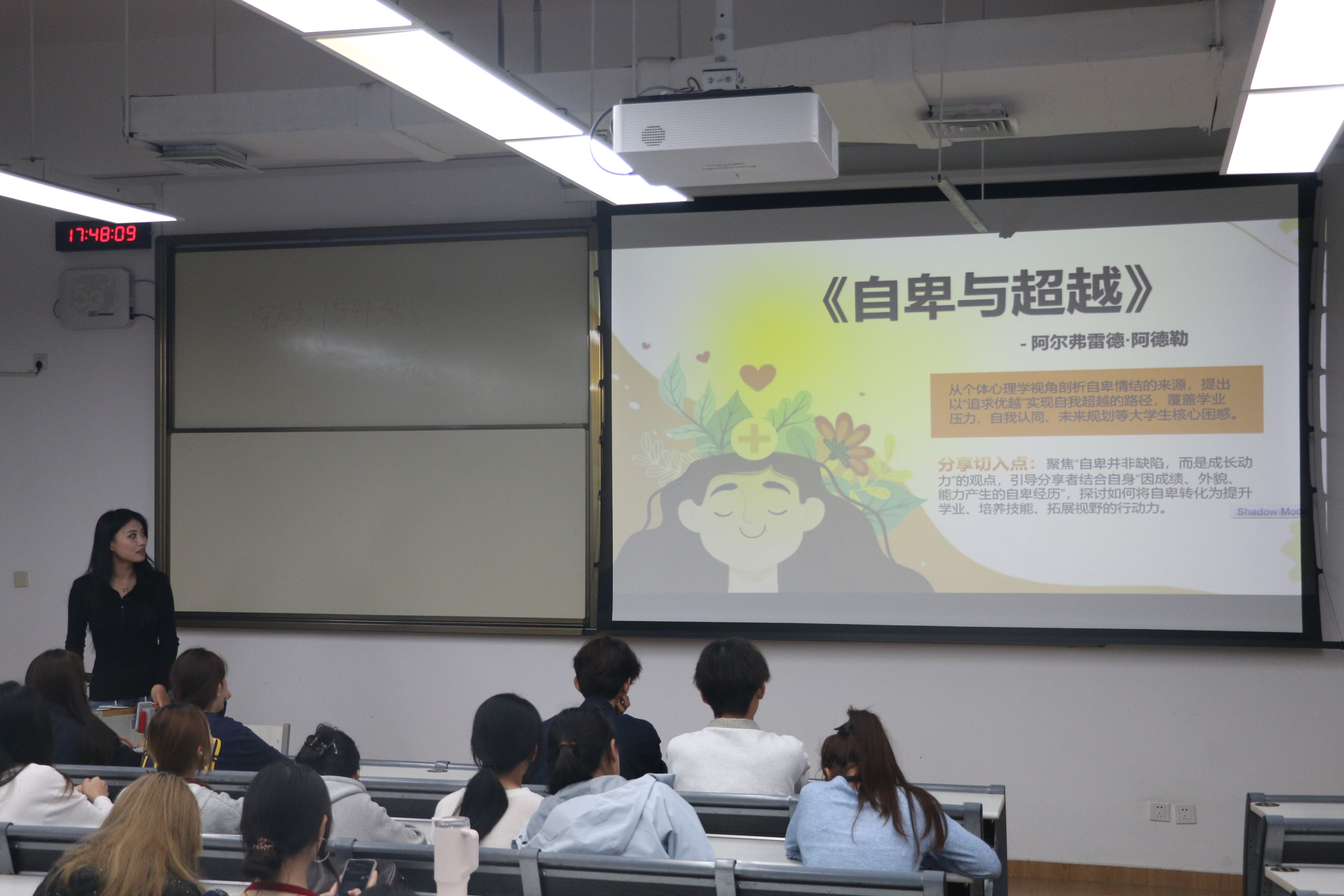 最后一位分享者聚焦于新生中普遍存在的“自卑感”与“迷茫感”,解读了阿德勒的《自卑与超越》。他指出,自卑感并非缺陷,而是驱动个体追求卓越的内在动力。关键在于如何将这种自卑感转化为超越自我的阶梯,通过建立有意义的社会兴趣(如关心他人、合作奉献)来实现个人价值。这为正处于自我探索期的新生提供了积极的心理视角:不必畏惧短板,而应着眼未来,在集体中找到自己的位置,实现从“小我”到“大我”的超越。